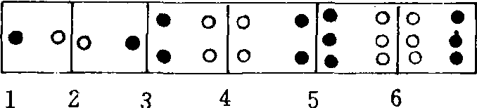 接龙卡。如左图所示。卡片两端都有若干个圆点,圆点数目为1~10个,运用圆点卡片可进行数字接龙、等量接龙(练习计数、加法运算、数组成等)。如图: