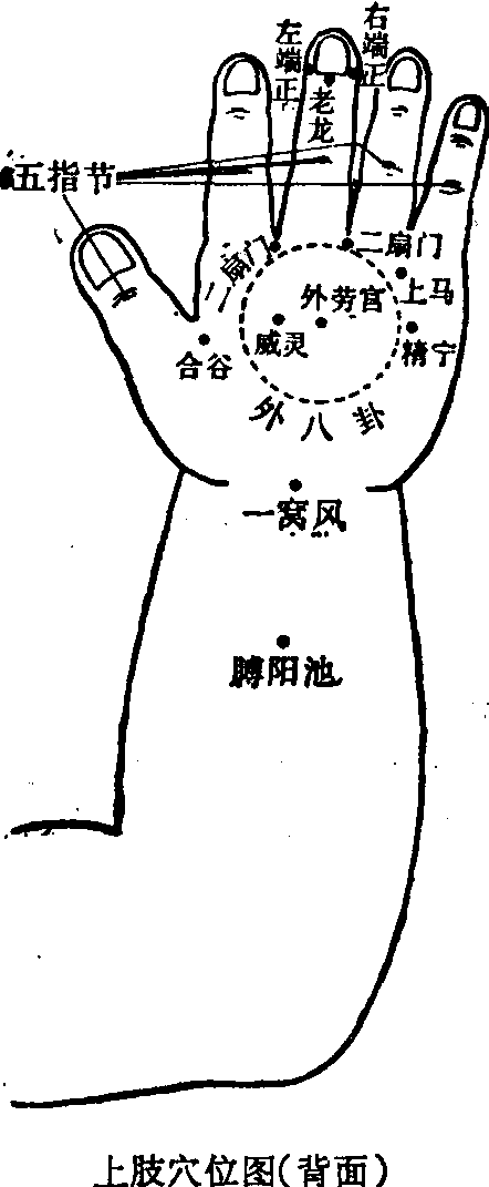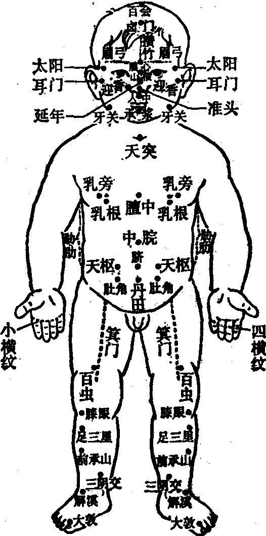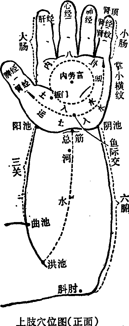 释义 | 推拿特定穴位 推拿特定穴位中医推拿在发展过程中逐渐形成了一套自成体系的穴位,这些穴位在清朝以前的医学著作中有明确的记载,但不同于十四经穴和经外奇穴,在临床上主要应用于小儿推拿,称为推拿特定穴位。推拿特定穴位与十四经穴位相比,有以下几方面的特点: 正面穴位图 背面穴位图图1 风池 又名“坎上”,见《针灸大成·按摩经》。位于目上胞,即眼的上睑缘与眶上缘所围成的一个区域。本穴与气池穴为成对的穴位,可作望诊用。若风池与气池为黄色,乃是吐逆之症;假如色见黄青,则为风;如果色红,患者即为惊啼烦躁。 气池 又名“坎下”,见《针灸大成·按摩经》。位于目下胞,即眼的下睑缘与眶下缘所围成的一个区域。本穴与目上胞的风池穴为成对的穴位。 三阴 见《幼科推拿秘书》,位于右眼胞,即右眼的上睑缘与眶上缘及下睑缘与眶下缘所围成的区域,与左侧的三阳穴为一对穴位,同作望诊之用。若三阴穴与三阳穴处虚肿,则心有痰。 三阳 见《幼科推拿秘书》,位于左眼胞,即左眼的上睑缘与眶上缘及下睑缘与眶下缘所围成的区域。本穴与其他穴位同用,可以治疗因寒而引起的小儿夜啼。 耳背高骨 又名“耳后高骨”,位于耳后颞骨乳突处,见《小儿推拿广意》。常用运法、掐法和揉法,能治风热之症。“运耳背高骨”,是常用的推拿方法。《小儿推拿广意》认为,在头面部推拿时,应先推坎宫穴,次推攒竹穴,再运太阳穴,继而运耳背高骨穴。“揉耳背高骨穴”,可作为治疗早期面瘫的方法之一,应用时,须与轻擦患侧面部的方法配合使用。 太阴 见阴阳穴。 龙角 又名“文台”,位于左鬓发处,与虎角穴为一对穴位,见《幼科推拿秘书》。 虎角 又名“武台”,位于右鬓发处,与龙角穴为一对穴位,见《幼科推拿秘书》。 两额 位于太阳穴的上方,见《幼科推拿秘书》。 牙关 位于颞下颌关节处。古代常用拿法和按法,治疗口紧不开; 用揉牙关穴的方法治疗齿痛。目前临床上在本穴用摩法、揉法或一指禅推法,治疗由于翼外肌功能亢进、翼外肌痉挛和咀嚼肌群痉挛而引起的颞下颌关节紊乱。 两颐 即腮,见《幼科推拿秘书》,作为望诊之处。若两颐见赤色,乃肺家客热。 左颊右颊 位于颧骨外侧,见《幼科推拿秘书》。 食仓 位于两颐下,即腮下,见《幼科推拿秘书》。 额角 即左侧的太阳穴和右侧的太阴穴之合称,见《幼科推拿秘书》。 有些头面部的穴位,由于其位置不够明确而未被列入。推拿头面部穴位时,有时根据病情,按照一定的次序进行。有两种按照次序进行的头面部推拿方法影响较大。一是清·《小儿推拿广意》(1676年),头面部的推拿次序是: 一推坎宫,二推攒竹,三运太阳,四运耳背高骨,五掐承浆,六掐两颊车,七掐两听会,八掐两太阳,九掐眉心,十掐人中。二是清·《幼科铁镜》(1695年),认为应该按照以下次序进行:开天门,分阴阳,揉太阴、太阳、掐天庭、眉心、山根、准头、人中、承浆。 上肢部穴位 上肢的推拿特定穴位最多,约占全部推拿特定穴位的半数,而其中的大部分穴位又集中于手部(图2)。在上肢穴位中,既有点状穴位,又有面状穴位和线状穴位。以五脏六腑的名称命名的手部穴位,由于各家的看法不同,因而一个穴位有好几个不同的位置,而在同一个位置上又有好几个不同的名称,很不一致,但目前公认的通用位置却比较一致。分别介绍于下: ![]() 图2 大肠 有四个不同的位置: ❶男性位于食指中段指骨的腹面,女性位于食指远端指骨的腹面,见《针灸大成·按摩经》。 ❷位于食指远端指骨的腹面,见《小儿推拿方脉活婴秘旨全书》。 ❸位于食指近端指骨的腹面,见《小儿推拿广意》。 ❹位于食指拇侧边缘一线,也称 “大肠侧”、“大肠筋”,见《幼科推拿秘书》,此处为目前临床上的通用位置。常用推法,也用掐法、抹法、揉法。能止泻痢,退肝胆之火,主治泄泻、痢疾和腹胀等症。本穴与脾土穴相配伍,治泄泻;与三关、阴阳、八卦、四横纹和龟尾等穴相配伍,治疗赤白痢; 与脾土、八卦等穴相配伍,能消食。 小肠 有四个不同的位置: ❶男性位于食指近端指骨的腹面,女性位于食指中段指骨的腹面,见《针灸大成·按摩经》。 ❷位于中指近端指骨的腹面,见 《小儿推拿广意》。 ❸位于食指中段指骨的腹面,见《幼科铁镜》。 ❹位于小指尺侧边缘一线,见《幼科推拿秘书》。目前在临床上,以小指尺侧边缘一线作为小肠穴者居多。常用推法,治疗腹泻。《小儿推拿广意》认为,小肠与三关、脾土、大肠、三焦、八卦和总筋等穴位配伍,能治疗疳热。 胃 有两个位置: ❶位于拇指近端指骨的腹面,见《小儿推拿广意》。常用推法,能止吐、止泻。 ❷位于拇指近端指骨的桡侧边。 胆 位于拇指近端指骨的腹面,见《小儿推拿方脉活婴秘旨全书》。据《小儿推拿广意》记载,本穴与三关、六腑、心经和阴阳等穴相配伍,治疗夜啼。 (手)膀胱 有二个位置: ❶位于小指中段指骨的腹面,见《小儿推拿方脉活婴秘旨全书》。 ❷位于小指近端指骨的腹面,见《小儿推拿广意》。 胞络 又称“心胞”、“包络”,位于无名指近端指骨的腹面,见《幼科推拿秘书》。 三焦 有四个不同的位置: ❶位于总筋穴与天河水穴之间,见《小儿推拿方脉活婴秘旨全书》。 ❷位于无名指中段指骨的腹面,见《小儿推拿广意》。 ❸位于中指中段指骨的腹面,见《幼科铁镜》。 ❹位于