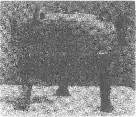 战国。炊器。通高27.5厘米,口径24厘米,腹径27.5厘米。重6.6公斤。1979年河北省容城县晾马台出土。容城县文化馆藏。此铜鼎长方附耳,圜底鼓腹,蹄形三足。身有子口,腹饰凸弦纹一道,底饰带纹一周,带纹中间饰十字纹。盖肩部饰凸弦纹一周,上饰对角半环形钮三个,钮身中间凸起脊带,上饰重环纹,钮顶凸起乳钉,上饰涡纹。盖中间设有活环提梁一个,环身饰重环纹、云雷纹。鼎身烟炱严重,厚达0.2厘米。年代属春秋晚期、战国初期之物。1979年出土时,铜鼎内装有铜壶盖大小两个。大盖与“西宫”铜壶吻合,盖上铭文与壶口处铭文相同。小盖口沿处阴刻“左征”二字。