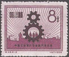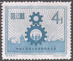 释义 | 中国工会第八次全国代表大会 发行日期:1958年5月25日 齿孔度数:14 印刷版别:雕刻版 图幅:28×23 全张枚数:120(10×12) 设计者:刘硕仁 雕刻者:孔绍惠 印刷:中国近代印刷公司 (1)4分 “8”字型齿轮 400万枚 (2)8分 “8”字型齿轮 800万枚 (1)-(2) 2枚全 |