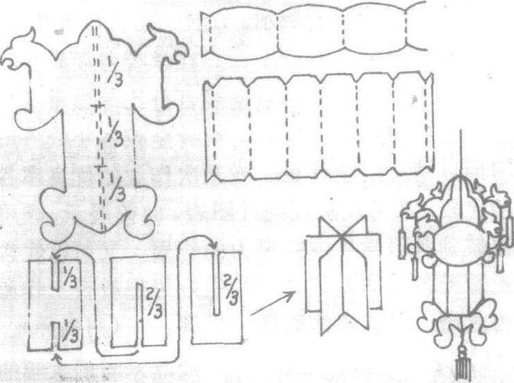 释义 | 插接灯饰 插接灯饰Chajie dengshi利用开缝对插方法组合成的吊挂彩灯装饰物。制作方法是,在吹塑纸上画图样,剪三片灯架,在三片同样的灯架片上开3种不同的开缝,第一片上下剪开1/3,第二片从下向上剪开2/3,第三片从上向下剪开2/3,将三片插接成六角形灯架。剪上下两条灯圈片,折叠后卡入灯架的上下两部分,组合成宫灯形挂饰。 插接灯饰 ☚ 组合彩球 悬垂挂饰 ☛ |