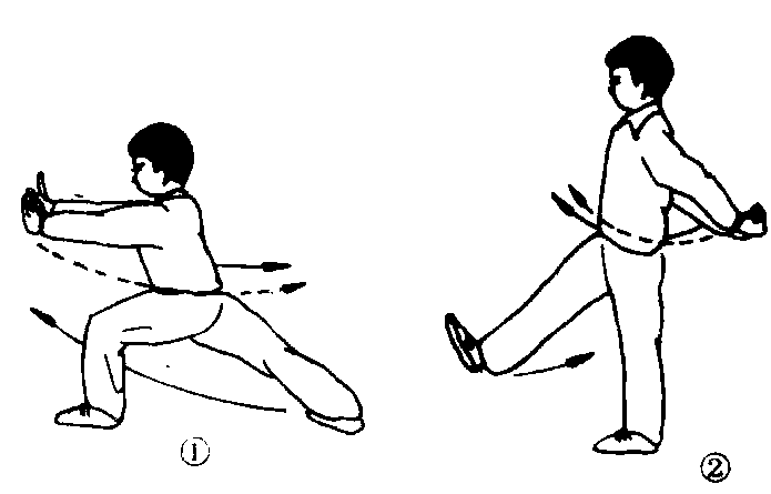 第二套少年拳动作之八。为搂手与勾踢依次完成的拳术动作。教学重点 强调: ❶右手要经头上向前抡摆至左掌背上。然后双手同时下搂并勾踢。❷勾踢时右小腿要以膝为轴, 迅速先屈再伸向左斜前方踢出, 脚尖要勾紧。
