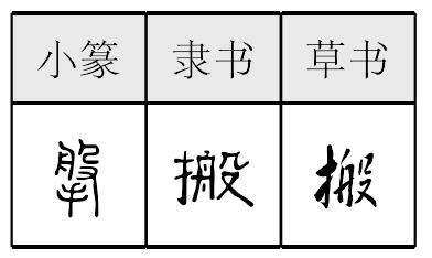 ❷生搬硬套 搬 金文;《説文》所無bān[扌(手,意符)+般(搬本字,聲意符)→搬(把較大或較重的東西移動到另一地方〈搬家,搬土〉;引申爲套用〈生搬硬套〉。)] [清] 吴敬梓《儒林外史·第二十七回》:“你作速看下一所房子……你同弟婦搬進去住著。” 魯迅《且介亭雜文二集·再論“文人相輕”》:“嵇康的送命,並非爲了他是傲慢的文人,大半倒因爲他是曹家的女婿,即使鐘會不去搬是非,也總有人去搬是非的。” 搬bān(13画)