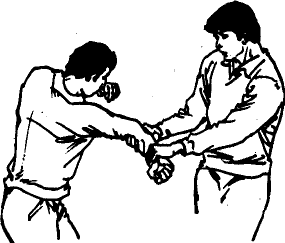 肘部擒拿法。当对方用右直拳进攻时,我以左手抓握其腕部使之屈肘,同时以右手由下方抓搬其肘关节,随之左手再做推按动作,使其肘部处于被动状态。