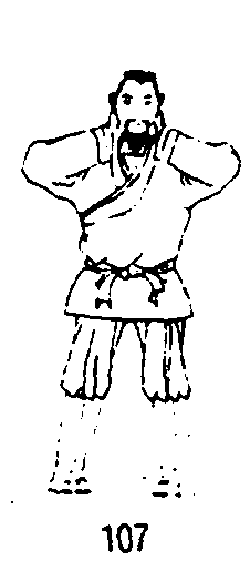 四十九式经络动功第3段“导气”动作之二(全套动作顺序第二十四式):❶随着吸气,提肛调裆;两掌从关元经天突上移至承浆穴,继而绕地仓、迎香、睛明至神庭将十指分开,用指尖从前发际梳到后发际。(图104、105、106)❷随着呼气,松腹松肛;两掌分别从后发际向前经面颊使中指端至承浆穴。(图107)练功次数:摩面梳头共做3次。要点:动作速度均匀,力量柔和;意在丹田,高血压患者可意守涌泉。