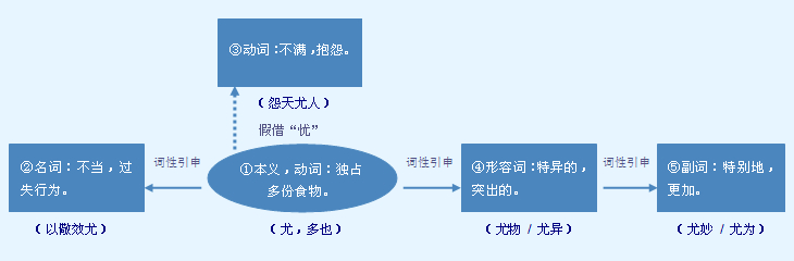 字源解说 又,既是声旁也是形旁,通“有”*,表示以手持肉。“尤”表面看指事字,其实是特殊会义字,由两个象形字“又” 交叉而成。尤,甲骨文 = (又,通“有”,手持肉)+ (又,通“有”,手持肉),表示一个接一个的“有”,意即拿得特别多。原始公社时代,人们均分各种利益,特别是均分肉食。人人所得相等叫“匀”;一人占有双份肉食叫“多”;一人独占多份食物叫“尤”。造字本义:一人独占多份食物,远超平均水平。金文 承续甲骨文字形。篆文 变形较大。隶书 将篆文的“又” 写成 。当“尤”的“独占多份肉食”本义消失后,篆文再加“月”(肉)另造“肬”代替。 “尤” 是抓持过多食物;“奇”* 是中原人所罕见的胡人骑马代步;“特”* 是祭祀时牺牲专用的小公牛; “异”* 是不正常的婴儿。 附 文言版《説文解字》:尤,異也。从乙,又聲。 附 白话版《说文解字》:尤,特异。字形采用“乙”作边旁,采用“又”作声旁。 引申线索