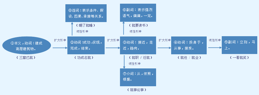 释义 | ![]() 副 表示在很短的时间内;表示事情发生得早或结束得早;表示前后事情紧接着; 表示限制人、事物或动作行为、状态的范围;在表示假设、因果、条件、选择、顺承等关系的复句中,用于后一分句表示相承接。 【同义】见“便”。 ❶ 表示时间早、过程短: 马上~走|他们早~出发了。 便 biàn 即 jí ❷ 立刻;马上: 说干~干|他一下班~回家。 便 biàn 即 jí ❸ 正是;事实正如此: 那位~是家父|我找的~是那个人。 便 biàn 即 jí ❹ 强调原来或早先已如此: 这书~是他的。 便 biàn 即 jí ❺ 表示一定情况或条件下的自然结果: 要是下雨,~不去|该怎么样,~怎么样。 便 biàn ★ “就”适用范围较宽。“即”、“便”属于书面语。 到;靠近: 各~各位|避重~轻|~着台灯看书。 去 qù ~世|~职。 ❶含有靠近、搭着的意思。出现在固定词组中时书面语色彩较浓,也可用于口语。常作带宾谓语,也可构成连动词组作谓语,当后面的宾语为双音节词语时,多带动态助词“着”。 各~各位|避难~易|避实~虚|避重~轻|功成名~|咸菜~稀饭|他~着油灯看书|喜旺下好了面,~着大蒜吃得挺香。 ❷只有,仅有。作谓语,必带宾语,宾语一般为包含有数量词的名词性词语。 我~两块钱|我~两天时间。 ❶表示时间。常出现在表时间的词语或其他副词之后,可表示动作在短时间内即将发生,相当于“立刻”“马上”;也可强调动作早已发生,相当于“已经”,书面语中可用“便”替换。 a.作状语。 展览明天~结束了,你还不快去!|四岁的时候,她~认识一千多个汉字了。 b.用在“早在……就……”格式中。 早在三年前,我们~开始研究这个课题了。 c.出现在“一(刚、才)……就……”的格式中,表示甲乙两事连续发生。 这句话刚说完,他~咽气了|一提儿子,大娘~眉飞色舞,来了精神。 ❷加强肯定语气,书面语中可用“便”替换;强调确定的范围,相当于“只”“只有”,含有排斥性。作状语。 没想到这位貌不惊人的老人~是蜚声中外的物候学家竺可桢|你~不该对他那么无礼|~小李知道那份文件放在哪儿了|他文化程度不高,~上过两年小学。 ❸用在出现数量词或含有数量概念的场合。如果“就”重读,表示说话人认为数量少;反之,则表示数量多。作状语。 我最近精神不好,一天~写300来字|最近写作很顺利,一天~写3000来字|他们家的客人,一来~一大串。 ❹用在假设、因果、条件、选择、目的、承接等关系的复句中,同“如果”“要是”“既然”“因为”“由于”“只要”“为了”等呼应,表示承接前面的意思,在书面语中可用“便”替换;也可出现在紧缩复句中。 如果你要叫护士,~请按这个电铃(假设)|由于准备得不太充分,我~没在大会上发言(因果)|只要肥料充足,一年~可以稻麦两熟(条件)|为了知道自己在人间受到多大的尊重,赫耳墨斯~化作凡人来到雕像店里(目的)|最近天气不好,不刮风,~下雨(选择)|列车把一些旅客抛在淋着雨的小站上,~毫不迟疑地顶着雨向西冲去(承接)|钱不够~申请分期付款吧!|他不亲自来请~不去。 ❺用在两个相同的词当中,表示容忍、无所谓;如果出现在动词性词组前并且重读,则表示态度坚决,同“偏”“偏偏”意义相近。 喝~喝,他的酒量还不如我呢!|脏~脏,反正没人上这儿来|苞米粥~苞米粥吧,总比饿肚子强|我~不说,看他们能怎么样?|他~要这么干,世芬怎么劝也没用。 引进动作的对象、范围或表示行为的凭据,同“趁着”“按照”“根据”“靠近”的意思相近。 a.常构成介宾词组作状语,可放在主语之前,有停顿。 ~事论事|~实论虚|最近有关专家~水资源紧缺问题进行了讨论|~现有的技术力量,我们完全能够承担这项工程。 b.可以同“来看”“来说”“看来”“说来”“看”“说”等搭配,构成独立成分。 这批产品,~主要指标来说,已经达到了国际先进水平|~前几集的情况看来,电视剧的改编者基本体现了原作者的意图。 表示让步性的假设,只能出现于复句的前一分句,位置在主语之后、行为动词或形容词之前,同后一分句的“也”“还是”等呼应;多用于口语,意义和用法大致同“即使”“就是”相当。 他们~告诉我,我也不想听|天气~再冷,他还是坚持冷水淋浴|你~把总工程师请来,也无济于事了|我~再胖,也赶不上你。 【辨】 (一)就和就是:见“就是”。 (二)就和才:见“才”。 【词语】 就便 就餐 就此 就地 就近 就寝 就任 就势 就事论事 就实论虚 就手 就算 就位 就学 就业 就医 就义 就职 就座 字源解说 又,既是声旁也是形旁,表示“手”的动作,抓持、托举。就,金文 ![]() ![]() ![]() ![]() ![]() ![]() ![]() ![]() ![]() ![]() ![]() ![]() ![]() 附 文言版《説文解字》:就,高也。从京,从尤。尤,異於凡也。 ![]() 附 白话版《说文解字》:就,往高楼去。字形采用“京、尤”会义。尤,表示异于一般。 ![]() 引申线索 ![]() 【字族索引】 就 尤 京 【同音字】 jiù |