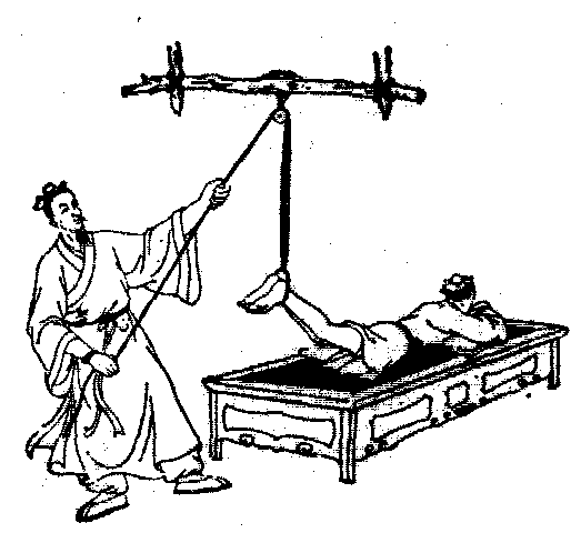 攀索,为患者两手攀于绳索后,悬吊两手,并使身躯离开地面,达到牵引的目的。《医宗金鉴·正骨心法要旨》云:“攀索者,以绳挂于高处,用两手攀之也。”它与叠砖合用,为古代一种脊柱过伸悬吊复位的方法。这种方法与危亦林著《世医得效方》中记述的“凡剉脊骨不可用手整顿,须用软绳从脚吊起,坠下身直,其骨使自归窠。”的悬吊牵引复位法原理基本相同。攀索者系用绳悬吊双手,而后一种方法则用绳悬吊双足而达到脊柱过伸以有利于复位。这种复位方法适用于稳定的屈曲型胸椎或腰椎骨折。患者必须体质健壮,无脊椎骨质疏松的青壮年。