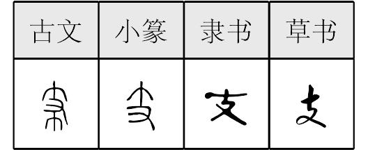 支 篆zhī[個(竹枝,象形) + 又(手,意符) →支(《説文》:“支,去竹之枝也。從手持半竹。 ,古文支。”支,分支。即從主幹上分出的枝條。通“枝”。可以再分支。引申爲支撑,支持。支是從干上長出的,引申爲支出,支付。又從“總部”分出的機構叫支部。我國古代用干支計年,“支”指地支又叫十二支:子、丒、寅、卯、辰、巳、午、未、申、酉、戌、亥。這和人的拇指以外的四指的十二個關節相當有關。配上天干:甲、乙、丙、丁、戊、己、庚、辛、壬、癸。這又和人的雙手共有十個指頭有關。十二和十的最小公倍爲六十。所以六十爲“花甲”。從甲子開始,直到癸亥,繁花似錦,故稱花甲。干支計年,早見於甲骨文時代,距今有三千三百年以上歷史記載。“手”成了隨身攜帶的“計算器”。所謂“掐指一算”,便能得知。)] 《詩經·大雅·文王》:“文王孫子,本支百世。”(文王的子子孫孫,幹和支百世昌盛。) 支(zhī)“ ,去竹之枝也。从手持半竹。凡支之属皆从支。 ,古文支。”(章移切) 徐锴《系传》:“竹叶下垂也。”段玉裁注:“此于字形得其义也。……(古文支)上下各分竹之半,手在其中。” 学者或认为“支”是“枝”的初文。徐灏《注笺》:“支、枝古今字。干支犹幹枝也。”如《诗·卫风·芄兰》:“芄兰之支,童子佩觿。”由“枝条”义引申为“分支”义。“支”还可以引申指人的肢体,如睡虎地秦简《法律答问》:“妻悍,夫殴治之,夬(决)其耳,若折支(肢)指、胅 (体),问夫可(何)论?当耐。”[1]后又专为此义造“肢”字。 支部只有一个属字“攲”,云:“持去也。从支,奇声。”意思是用筷子取物。“支”多作声旁,如“枝、肢、伎、歧、岐、跂、忮、屐”等字,其义与跂出、多杈、支撑等有关。 支zhī(4画)