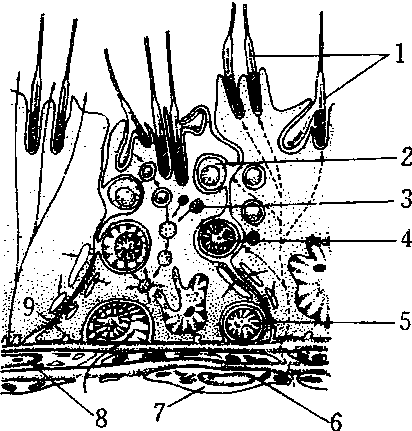 支柱细胞的形态与功能 1.精子 2.精子细胞 3.溶酶体 4. 精母细胞 5.精原细胞 6.内皮细胞 7.毛细血管腔 8.类肌细胞 9.血睾屏障 支柱细胞pillar cells系曲细精管壁上的一种体积最大的细胞。此细胞呈圆锥形,底部居于基膜上,顶端伸向管腔,分散在各阶段的生精细胞之间。细胞核较大,呈圆形或不规则圆形,一般约9~12μm,核膜凹陷,常形成一些皱襞,核内染色质较少,有1~2个明显的核仁。胞浆丰富,含有大量细长的线粒体、高尔基体、原纤维和脂滴等。支柱细胞的周围有各期生精细胞嵌附上面,其顶端有数个精子伸入胞浆中,因此认为支柱细胞对生精细胞起支持、保护和营养作用。亦有人认为对精子排放有一定作用,支柱细胞失去功能,精子则不能成熟。 |