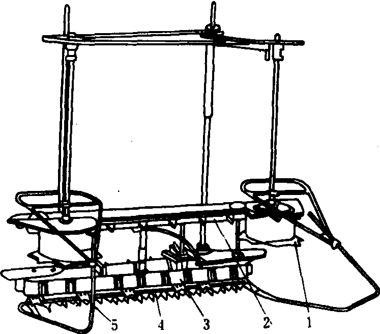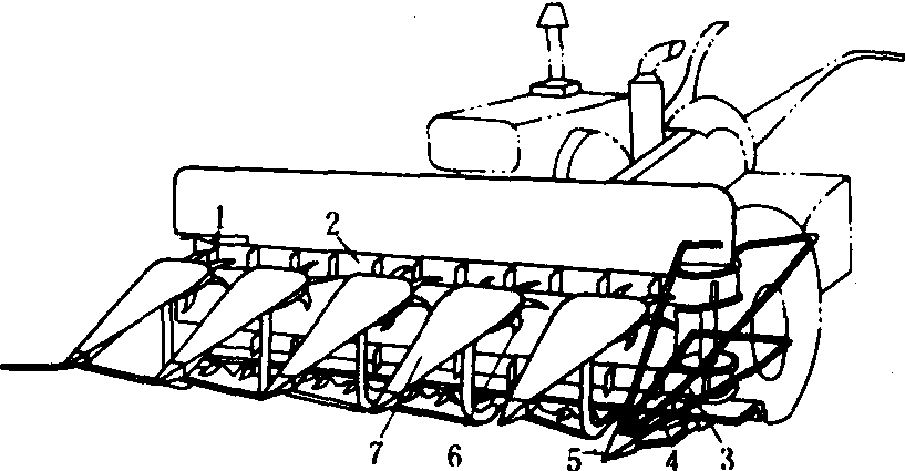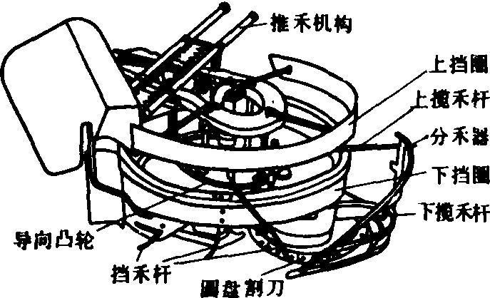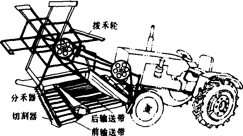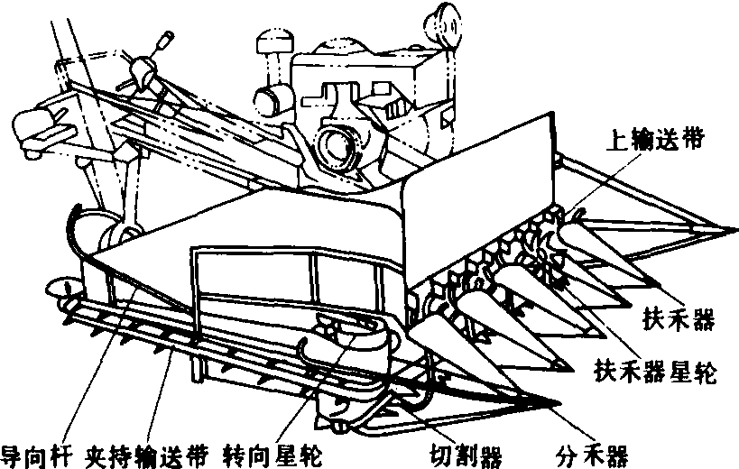 释义 | 收割机shōugējī用于割取小麦、水稻等农作物的机器。有的收割机还可以一次完成收割、脱粒。例如:“在柴达木和克拉玛依像森林般耸起的石油井架,在北大荒的榛莽中,收割机正倾泻着瀑布般金色的谷粒。”(《新观察》1957.14.4页) 收割机grain reaper谷物收获机械的一种。用以割倒稻、麦作物,并将其铺放成适于由人工分堆捆束的禾条或禾堆。 图1 卧式割台收割机 立式割台收割机 有机侧放铺和机后放铺两种。 机后放铺收割机 在中国主要为北方套种地区收割小麦而研制的,它的工作幅宽等于畦内小麦播种宽度,其结构如图2。作业时,在扶禾器的三角带拨齿与星轮的配合下,作物上部被拨送到割台的上输送带,作物的下部被切割器切割,切割后的作物受到扶禾器星轮和上下输送带拨齿的作用横向运移。在此过程中星轮下的压条不但能防止作物前倾,避免堵塞,而且使作物紧贴台面,作物与台面间产生的摩擦力可平衡拨齿作用力、保持作物在直立状态下输送。当作物输送到割台右端时,即被传递给转向星轮,由转向夹持输送带向后输送,越过拖拉机地轮,由导向杆横向压倒铺放于地面。这样,割台两边畦埂上套种的其他作物幼苗便不会被铺放的小麦所覆盖。 图2 机后放铺立式割台收割机 切割器和上下横向输送带由手扶拖拉机动力输出轴经传动机构驱动,而拨禾星轮和与之同轴的带拨齿的扶禾三角带由上输送带的拨齿带动。星轮拨齿均为后倾的弧形齿,便于卸草。 机器作业速度一般为1.0~1.4米/秒。当工作幅宽1.85米时,生产效率可达每小时8~10亩,拨禾星轮直径通常为280毫米左右,线速度为1.6米/秒,扶禾三角带线速度0.8~0.9米/秒,上下输送带线速度1.9~2.0米/秒,转向输送带线速度与之相仿。 机侧放铺收割机 有拨禾星轮式和扶禾星轮式两种。拨禾星轮式的结构如图3(a)。作业时,靠作物的惯性和前方作物的依托,使已割作物贴近于上下输送带,并保持作物直立横向输送到一侧,通过拨禾星轮使作物向外倾倒,形成穗头朝外,禾秆与机器行进方向接近垂直的禾铺。为了保持作物能在直立状态下横向输送,下输送带的线速度(1.5~1.7米/秒)比上输送带的线速度(1.2~1.3米/秒)略高。该机型可通过换向机构改变输送带的运动方向,使作物向左或向右输出,便于进行梭式作业。该机主要缺点是幅宽不能太宽(0.9~1.2米);必须满幅收割;机器行走到作业行程末尾时,割后作物由于失去前方作物的依托而不能紧贴输送带移动,易造成地头散株损失。 扶禾星轮式是在机后放铺收割机的基础上发展成的。其结构如图3(b)。它取消了机后放铺收割机转向机构、后输送机构和带拨齿的扶禾器三角胶带,而在上输送主动带轮上安装拨禾星轮,用来卸除输送带上的作物,放铺成穗头朝外,禾秆与机器行进方向接近垂直的禾铺。由于该机型的前部有若干组扶禾器和扶禾器星轮,保证了作物在割台上的直立输送,因此割幅可宽达1.8米左右。 立式割台收割机结构紧凑,纵向尺寸小,轻便灵活,操纵性能好,适于在小块地上收割稻、麦。与手扶拖拉机和小功率四轮拖拉机配套,割幅在2米以内。存在的问题是不能收割倒伏较严重的作物。 (a)拨禾星轮式 (b)扶禾器星轮式 图3 机侧放铺立式割台收割机 1.拨禾星轮; 2.上输送带; 3.下输送带; 4.切割器;5.分禾器; 6.扶禾器星轮; 7.扶禾器 圆盘割台收割机 主要特点是能将切割作物集束铺放,其结构如图4。作业时分禾器、上下揽禾杆和圆盘割刀绕回转割台的轴心作顺时针回转,圆盘割刀在公转的同时,又按逆时针方向自转。分禾器将待割作物聚集在上下挡圈和分禾器之间,由圆盘割刀将其割断。上下揽禾杆将割断作物揽集并使之随分禾器转到机器前进方向的右侧,已割作物因受到装有挡圈上的挡禾杆的弹力作用而逐渐集紧,而揽禾杆则在导向凸轮控制下缩进挡圈内,由推禾机构将成束作物推出铺放在田面。分禾器和切割器又转至机器左侧,开始下一周的收割。圆盘割台的割幅一般不大于1米。 图4 圆盘割台收割机 收割机将稻麦等作物割倒并铺放于田间的谷物收获机械。1799年美国出现马拉的圆盘割刀收割机。1826年出现转臂收割机雏形。1851年出现摇臂收割机。1920年后出现拖拉机牵引的收割机。中国于20世纪50年代生产马拉收割机,60年代生产机力收割机。类型主要有卧式割台收割机、立式割台收割机和圆盘割台收割机3种。中国1998年拥有收割机1030814台。 收割机harvester;reaper |