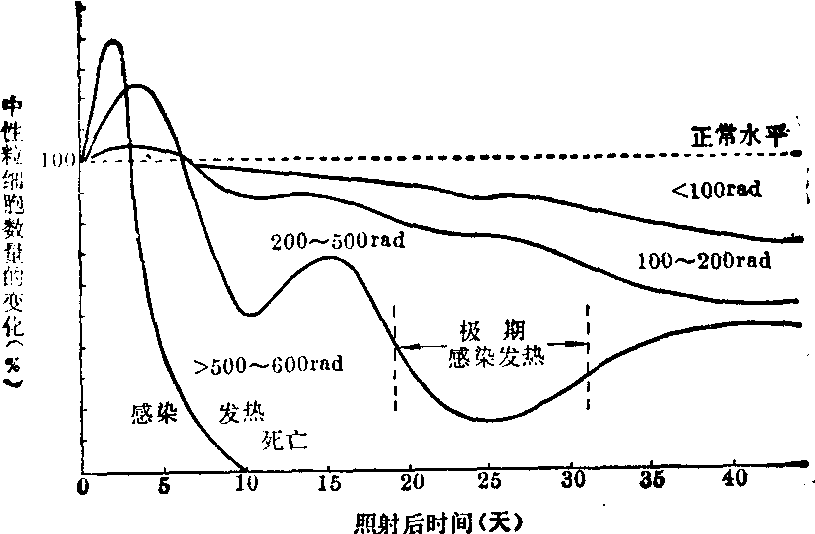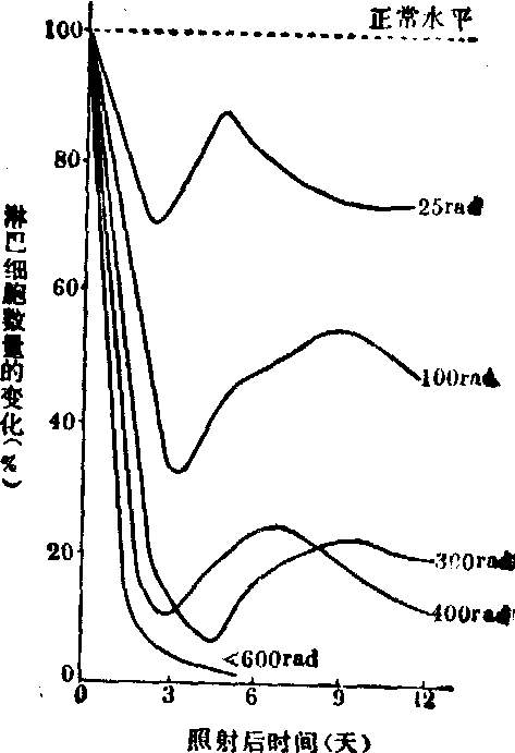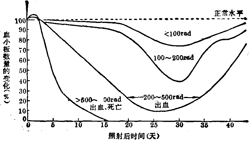 粒细胞对辐射反应是敏感的,其变化程度与照射剂量有明显的关系(图2)。数量变化有一定的时相性。在接受一定剂量照射后,粒细胞数有一时性的迅速升高,一般认为这与照射后血液重新分配有关。也有实验证明这与照射后大量肾上腺皮质激素释入血内有关。但由于骨髓繁殖细胞受到损伤,血中粒细胞数又很快减少。 在中等剂量(200~500rad) 照射后一段时间内粒细胞又可出现第二次一时性回升(人在第10天、兔在第7天、狗在第7~8天)。这次回升时间与动物粒细胞成熟所需时间比较一致; 因而人们认为这次一时性的回升是照射后分裂受抑制的原粒细胞恢复分裂能力所致。但这些原粒细胞是些伤残细胞,经一度分裂后又失去繁殖能力,故粒细胞在回升后不久又下降。 粒细胞数下降速度和下降最低值与照射剂量密切相关。当粒细胞数下降到最低值时,机体将出现严重的感染、出血、衰竭,甚至死亡。如机体能度过极期,则会逐渐恢复,于是骨髓中干细胞分裂和繁殖相继出现并逐渐加强,待成熟的粒细胞进入血液后,外围血液中粒细胞数逐渐上升。各类白细胞恢复到正常值的次序是: 单核细胞→嗜碱粒细胞→中性粒细胞→嗜酸粒细胞。 除数量变化外,粒细胞在质量上亦有所改变。从形态上可见粒细胞大小参差不一,核有空泡、肿大、溶解、固缩、崩解、胞质浑暗污秽、颗粒不清晰等。在电子显微镜下可见粒细胞的核、核膜、线粒体、溶酶体、胞质发生一系列退行性变。 由于射线对骨髓内原始巨核细胞的损伤,血液中血小板也逐渐减少,减少的程度和速度与照射剂量密切相关(图3)。 人的血小板寿命为9~10天(大鼠4.5天,小鼠4天),所以照射后人血液中血小板数量的下降比动物缓慢些。血小板不仅在数量上,而且在质量上也有所改变,如衰老血小板数相对增多,有时也出现一些巨型血小板 (可有红细胞甚至粒细胞大小)。在电子显微镜悬滴标本中可见血小板透明带缺损或消失,伪足减少、消失或变为鼓锤状,原浆中含5-羟色胺的颗粒减少等改变。 图3 不同剂量照射后血小板数量的变化(%) 红细胞也有变化,如以1,000rad照射大鼠,其红细胞在扫描电子显微镜下表面出现凸凹不平。由于骨髓中原始红细胞对射线十分敏感,照射后有明显损伤,表现为血液中网织红细胞很快减少。 血液中有形成分的变化对机体气体交换、免疫反应均有严重影响,对凝血、血管通透性有明显作用,这对照射后机体抵抗力、炎症反应、出血、感染极为重要。 2. 消化系统: 消化系统对辐射敏感的次序是:小肠>结肠>胃>口腔>食管>肝。 小肠绒毛被覆上皮不断更新。被覆上皮的干细胞存在于肠腺隐窝底部,它们不断分裂、成熟并逐渐向上移行到绒毛顶部以代替脱落的细胞。分裂中的细胞对射线是十分敏感的。以100rad全身一次照射后,即可见肠腺隐窝底部细胞分裂相一时性消失。剂量越大,细胞分裂相中断的时间越长。超致死剂量照射后可使正常分裂相难以出现。中小剂量照射后,损伤可以很快得到修复,故除极期可在胃肠出现一些出血、溃疡外,早期见不到重大变化。超致死剂量照射后可出现小肠粘膜广泛性的坏死、脱落,导致水和电解质大量丧失。 结肠的改变一般比小肠轻微。胃亦可出现小的出血灶和溃疡。食管变化较少。口腔粘膜可在中等剂量照射后出现出血、糜烂和溃疡。 在消化道出现形态改变之前就已有功能及代谢改变。一定剂量照射后可出现粘膜重量下降,粘膜内蛋白、DNA量减少,RNA酶及蛋白酶合成下降,磷酸酶及蛋白水解酶则增多,5-羟色胺含量下降,乙酰胆碱含量增加,细胞中钾减少,钠增多。照射后消化道可立即出现排空延缓,肠逆蠕动加强。小肠对糖、蛋白质、脂肪吸收发生障碍。 肝脏因为代偿能力强,故只有在大剂量照射后才有坏死灶出现。电子显微镜下证实,肝细胞对射线敏感,而是由于其代偿力强,修复快,而给人们以不易受到损伤的印象。 3. 神经系统: 0.05R照射可致脑电和条件反射改变。这表明神经系统对辐射是敏感的。 照射后脏器中的压力及化学感受器在早期可出现兴奋性加强,晚期则减弱,甚至完全消失。中枢的兴奋性在早期升高,而后恢复正常,最后出现波动或降低。神经反射变化与致伤时脏器所处状态、照射剂量有密切关系。 在形态学上,照射可引起神经组织充血、出血、坏死,胶质细胞增生及神经纤维脱鞘。病变可出现在皮质、中脑、间脑、小脑、延髓、脊髓等部位。 4. 心血管系统: 在中小剂量照射晚期或大剂量照射后,心肌中可出现出血、变性、坏死。而血管,特别是中小血管、微血管可在小剂量照射后,于早期即出现内皮细胞肿胀、脱落或坏死,血管壁出现浸润、变性,甚至坏死。 在辐射损伤后可出现心跳加速,传导阻滞,心电异常,血管通透性及脆性增高等。心脏及血管变化的程度与照射剂量有关。临床症状与病变部位有关。 5. 内分泌系统: 在中小剂量照射后垂体中ACTH、TSH含量均增高,而后由于垂体细胞渐次出现变性、坏死,垂体功能渐渐减退。 在一般情况下,照射后肾上腺皮质功能立即增强,照射剂量越大,血液中皮质激素浓度上升越高,维持时间也越长。在致死病例可出现第二个高峰。肾上腺功能增高主要是糖皮质激素增加。在正常情况下,血浆中的皮质激素多与一种运载皮质激素球蛋白相结合,少部分呈不结合游离状态,而起作用的正是这些游离部分。放射损伤