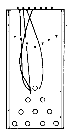 放瓶区是指球道末端长度约为86厘米的保龄球排置范围。10个球瓶的排列方式为倒三角形排列,放瓶区嵌有球瓶标识点。从球瓶的中心算起,球瓶形成为边长12英寸的等边三角形。现代保龄球场普遍采用自动球瓶放置装置取代手动式排球装置。(见图2—3—62)