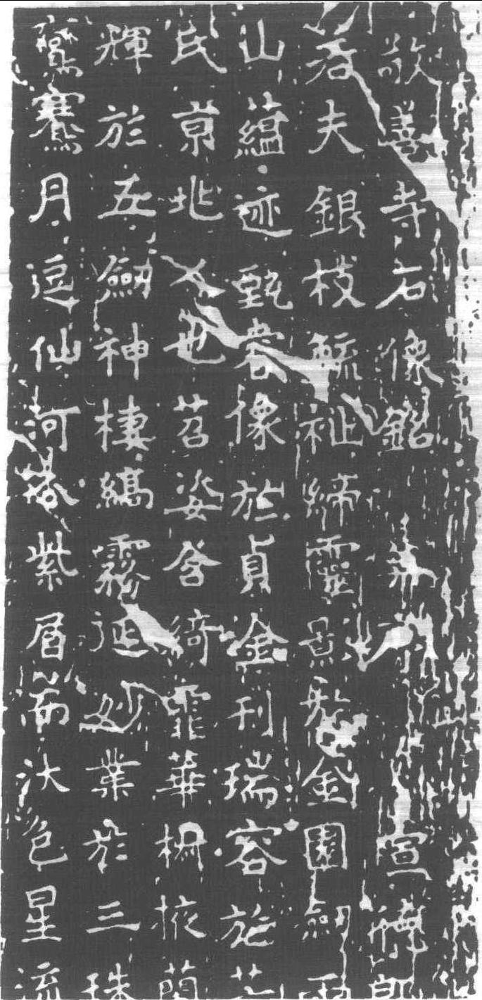 释义 | 敬善寺石像銘敬善寺石像銘 (局部) 唐 碑(無年月)。清王昶《金石萃编》作乾封二年(666)。李孝倫撰,無書者名。楷書十五行,行二十八字。文既典雅,書亦遒健,實勝於南朝造像之粗陋; 而别字頗多,則猶沿襲北朝習氣。字形縱長,呈率更(歐陽詢) 風尚,時間隸意,筆法真率。現存河南龍門石窟。窟内北魏碑占绝對優勢,而此唐石亦甚杰出,與唐·顯慶三年 (658)〈王居士磚塔銘〉相伯仲。 |