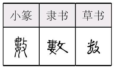 數,形声,从攵或攴,婁声,本义读shǔ,计算,引申为逐条列举过错、责备、计算起来(最突出)等;又读shù,引申为数目、几个(不确定的数目),假借为命运;又读shuò,引申为副词,屡次。《简化字表》类推简作“数”。 【辨析】 以“数”作音符构成的形声字一般读sǒu:擞、薮。数〈动〉(1)数落(lào);说唱。 《金》五一: 先是郁大姐~了回《张生游宝塔》,放下琵琶。孟玉楼在旁斟酒哺菜儿与他吃,说道:“贼瞎贱(曳)磨的,唱了这一日,又说我不疼你。” (2) 称道;看得起。 《金》五八: 没廉耻的小妇人,别人称道你便好,谁家自己称是四娘来?这一家大小谁兴你?谁~你?谁叫你是四娘? 另见shù。