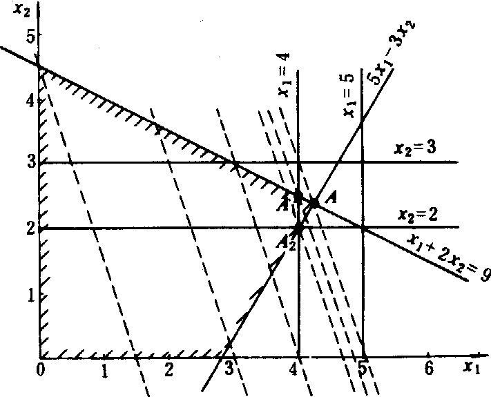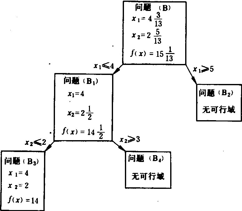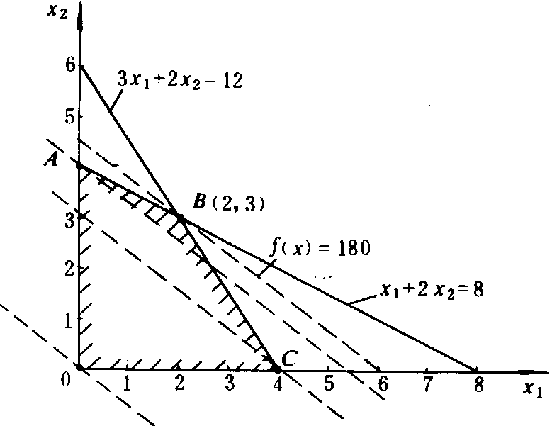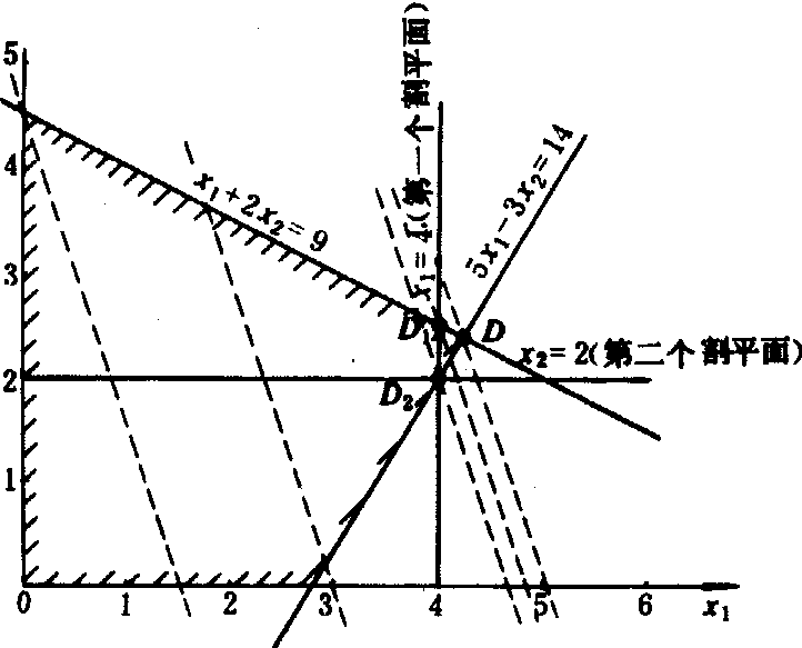 释义 | 数学规划mathematical programming在一定约束条件下解目标最优化问题的数学方法。又称规划论、数学规划论。是运筹学(见运筹学模型)重要分支之一。它应用于最优化设计,资源配置与管理等方面。构成一个数学规划问题的基本要素是:❶决策变量,反映系统内部要作出决策的具体对象; ![]() 满足约束:3x1+2x2+x3=12 x1+2x2+x4=8 xj≥0,(j=1,2,3,4)该例可用图解法求解(图1),图1中各约束方程所围成的阴影区域ABCO上的每个点(包括边界上的点)都是满足约束条件的解,为可行解,该区域为可行域。A、B、C、D为顶点(可行域有时也可能无界)。目标函数f(x)=30x1+40x2,在坐标平面上是随f (x)取不同定值时的一族平行的等值线。位于同一直线上的点,具有相同的目标函数值。如图1中虚线所示。其中通过可行域顶点B的目标函数值最大,所以B点对应最优解,即x1=2, x2=3(百千克)f(x)=180(元)。图解法不适于求解高维问题。丹齐克提出的单纯形法,则是解高维线性规划问题的一种基本方法。它是基于凸集理论,即线性规划问题在几何学上,相当于满足线性约束集所构成的凸多面体(可行域),每一个顶点对应于线性规划问题的一个可行解,且满足非负约束,故又称为基本可行解。可以证明,线性规划若存在最优解,必在可行域顶点上达到,如图1中的B点所示。这是线性规划解的一个基本性质。因此,通过顶点的每一次迭代逐次改善目标函数值f(x),当达到某一顶点,不再能改进目标函数值时就得到最优解。单纯形法可以用单纯形表来实现。 图1 两种产品产量的可行域和最优解 对偶问题 任一线性规划问题(称为原问题),都存在另一个与它互为对偶的线性规划问题,称为对偶问题。设线性规划的原问题为:目标函数: maxf(x)=cx (7) 满足约束:AX≤b (8) X≥0 (9) 其对偶问题为:目标函数:ming(Y)=Yb (10) 满足约束:YA≥c (11) Y≥0 (12) 式中 Y为1×m列向量。若问题有最优解,两者的目标函数值相等,即maxf (x)=min g(Y)。若原问题有可行解,但无最优解,则对偶问题无可行解。有时把原问题变换成对偶问题更便于求解。yi称为对偶变量。当得到实际问题的最优解时,Yi是第i种资源在实现最大利润时的一种价格估计,也称为资源bi的影子价格或机会成本。当yi=0时,表明第i种资源有剩余,原问题中对应的第i个约束方程的松弛变量大于零。当yi≠0时,表明第i种资源已充分利用,原问题中对应的第i个约束方程的松弛变量等于零。在保持原问题最优解的情况下,增加资源投入量△bi,引起目标函数值增量为△f(x)=△bixyi,yi=△f(x)/△bi,所以,对偶变量yi相当于资源bi的边际生产力。敏感性分析 (又称优化后分析)实际问题中,参数aij、bi和cj并非有唯一确定值。当其变动超出允许范围时将使问题的最优解发生变化,甚至不再是最优解。在保持问题最优解的情况下,分析参数aij、bi和cj允许变动的范围,称为敏感性分析。 运输问题 以最小的总运费将物资由m个供应地(称发点)运至n个需求地(称收点)的调运规划问题。这是一类特殊的线性规划问题。其数学形式为:目标函数: ![]() 中国在1958年运用表上作业法规划物资调运。1980年以后,线性规划已在中国农业区域经济发展规划、农业生产的劳(力)畜(力)机械优化配备、饲料配方、农业投资分配等方面应用。1984年建立的中国种植业发展结构线性规划模型含8702个变量和3287个约束方程。国际上如1975年美国农业和农村发展中心的线性规划模型(CARD),其中最大的一个模型含75 000个变量和10 000个约束方程。 整数规划 要求全部或部分变量取整数值的数学规划。实际问题中的许多变量,如机器台数、人数等必须是整数,而线性规划的解不一定是整数,若简单地圆整为整数,其解不能保证是整数可行解或最优整数解。整数规划可分为纯整数规划和混合整数规划。前者要求全部变量是非负整数;后者仅要求部分变量是非负整数。当变量取值限制为0或1时,称为0—1规划。 线性整数规划 目标函数和约束方程是线性的整数规划。一般是在解线性规划问题基础上,采用分解算法和割平面法求得问题的最优整数解。给定整数规划问题A:minf(x),满足约束 ![]() 分枝定界法 以下面的整数规划问题(A)为例。求: maxf(x) =3x1+x2 (1) 满足条件:![]() ![]() ![]() ![]() ![]() ![]() 图2 分枝定界法的求解 图3 分枝定界法求解过程 割平面法 仍以上例说明。首先求松弛问题(B)的最优解 ![]() x1+2x2+x3=9 (6) 5x1-3x2+x4=14 (7) 然后把非整数的基变量x1和x2用非基变量x3、x4来表示,得![]() ![]() ![]() ![]() ![]() ![]() ![]() ![]() ![]() 多目标规划 研究具有多于一个目标函数问题的数学规划。也称多目标最优化。是数学规划的一个分支。1896年意大利经济学家帕雷托(V.Pareto)从经济学角度提出多目标最优化问题,并用权系数法解决了某些实际问题。1951年库普曼斯(T.C.Koopmans)最先引入了解的有效性概念。用来描述多目标规划最优解的性质,从而给出了多目标最优化的确切含义。农业系统实际问题大多有多目标要求,因而,多目标规划的研究与应用有重要意义。 图4 割平面法的求解 分类 多目标极小化问题通常记为(VMP):V- ![]() ![]() 解的有效性 多目标规划问题一般不存在绝对最优解,即使得各目标同时达到最优,这就需要引入有效解和弱有效解等概念。如果存在一个可行解 ![]() 多目标规划的算法 一般情况下是把多目标规划问题转化为单目标规划问题求解,如约束法、线性加权和法、分层