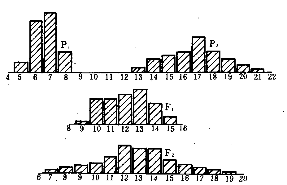 数量性状有两个重要特点:一是受环境影响较大。例如相同基因型的动植物个体,在不同营养或水肥条件下,体形大小相差较大,同一作物品种在不同栽培管理条件下,产量明显不同等等;二是群体内个体间的差异小,如果按植物个体的高矮或轻重顺序排列起来,则在两极端之间,往往表现出从高到矮或从重到轻的连续变异,表现中间程度的个体较多,表现为两极端的个体较少,它们的频率分布趋近于正态分布。数量性状受微效多基因控制,质量性状则由主效基因控制。但二者常难于区分的。生物的性状常常既有由主基因控制的,又有由微效多基因决定的; 而且在一种情况下表现为质量性状,在另一种情况下可能表现为数量性状。作物的抗病性状有时就是这样。事实上连续变异比非连续变异更普遍。由主效基因控制的质量性状,也常可见有微效基因共同参与作用的。数量性状的遗传不能追踪个别基因的作用,故其遗传效应不能用个体表型的数值表示,而要用群体的平均值表示;并通过一定的试验设计,用取样的方法,求出群体的其他统计值,如方差、协方差、相关系数与回归系数等,估算群体的遗传参数。数量遗传学中的重要遗传参数:有遗传力(见遗传力)、遗传相关、配合力、选择响应等,在动植物育种中是经常采用的。 数量性状的遗传受多基因支配,每个基因的作用微小而相似,彼此的作用可以累加,等位基因之间不存在显隐性的区别,故F1代的表现型常介于两极端亲本之间。如果某性状的遗传涉及n对基因时,则F2代各类个体的频率分布,将符合(1/2+1/2)2n二项式展开时的各项系数。牵涉的基因愈多,则分组数愈多,组间的差距愈小,加上环境对性状的影响和修饰作用,组间的界限实际上就无法区分,因而造成为连续分布。例如玉米穗长的遗传(见图)。 数量性状quantitative character变异有连续性并不易于归类的定量性状。农作物及畜禽的大多数经济性状都是数量性状,例如植株高矮、果实大小、个体产量、生育期长短以及蛋白质、糖分等含量、泌乳量、产卵量等等都是必须量度和用数字表示并借助统计学方法进行遗传追踪与研究分析的性状;受环境影响大,遗传较复杂;受微效多基因控制,因其数量多,每个基因效应小,难于区别个别基因的作用并进行定位。但有时某些连续变异的性状中也会出现明显区分的变异,如果蝇的突变性巨体、果蝇腹刚毛数目可向无毛或矛状刚毛变化,以及玉米的某些矮变株等,都又是单个基因作用所致,因此数量性状与质量性状间既有区别也不能绝然划分(见“质量性状”)。 数量性状见“生物”中的“数量性状”。 数量性状又称“度量性状”。一个群体内的各个体间表现连续变异的性状。如人的身高,作物的产量等。 数量性状quantitative character是指连续性变异的性状。一般呈正态分布,如人的高度、皮肤颜色、唇裂腭裂等。 数量性状quantitative character |