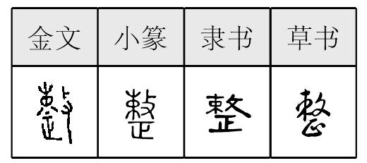 【提示】上左是束,7画; 束位于字左时,末笔捺改点;不要错写成束。上右是攵,4画,不要错写成3画的 夂。 *整zhěng16画 攴部 (1) 有秩序有条理: ~齐|~洁|平~|衣冠不~。 (2) 使有秩序有条理: ~理|~顿|~风|~装待发。 (3) 修理;修饰: ~容|修~。 (4) 使吃苦头: ~人|挨~。 (5) 〈方〉搞;弄: 这事咋~|~了一桌饭。 (6) 齐备;没有缺失或剩余: ~体|~年|完~|三百元~|化~为零。 (7) (~儿)整数: 把钱凑个~儿。 整 ☚ 敃 效 ☛ 整zhěng小篆以来的会意兼形声字。从攴(扑本字),从束,从正,正亦声。也作从正从敕(chì),正亦声。正(即整)敕,或作整饬。是整顿,整齐义。指有秩序,不乱。如:整洁|整齐。又指不残缺,完全的。如:完整|整套(即全套)|一整天。组词如:整数。转为动词,指整理,整顿。如:整队|整风|整理|整顿。引申为治理,搞,弄。如:桌子坏了整一整|整旧如新。当代又引申转义为使吃苦头。如:不要随便整人。 整★常◎常