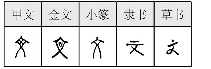 文 甲骨文; 金文; 篆wén[紋身,象形。(《説文》:“文,錯畫也。象交文。” 文,初文像人的胸部刺有“紋飾”,或作“心形”,或作“口形”。到了篆文,省去紋飾。文,紋本字。指文字〈甲骨文、金文(鐘鼎文)、篆文、龍文、漢文〉,指篇幅不太長的單篇作品〈文章〉,人類所創造的物質財富和精神財富的總稱〈文化、文明、文物〉,非軍事的〈文職、文官〉,柔和〈文雅、文質彬彬〉,古人在身體上刺出花紋〈文身〉。古銅幣一面鑄字,故稱一枚錢爲“一文”〈一文不值、不取分文〉。不識字〈文盲〉。指法令〈條文〉。掩飾〈文過飾非〉,各種文化現象〈人文〉,某些自然現象〈天文、水文〉。)] [西漢] 司馬遷 《史記·周本紀》:“文身斷髪,以讓季曆。”(在身上刺了花紋,截斷頭髮,以便讓位給季曆。) [南朝梁] 劉勰《文心雕龍·原道》:“人文之元,肇自太極。”(人類文章的起源,起始於太極。) 文(wén)“ ,错画也。象交文。凡文之属皆从文。”(无分切) 甲骨文作 、 、 ,金文或作 、 、 、 、 、 ,均象正面站立的人形;人的胸部刺有花纹,此以“纹身”之“纹”为“文”。《史记·赵世家》:“夫翦发文身,错臂左衽,瓯越之民也。”司马贞索隐:“错臂亦文身,谓以丹青错画其臂。”又引申为花纹或纹理。如《左传·隐公元年》:“宋武公生仲子,仲子生而有文在其手,曰为鲁夫人。”晁错《论贵粟疏》:“衣必文采,食必粱肉。”张舜徽云:“文之言分也,谓资此以分别万物也。……本书《叙篇》云:‘见鸟兽蹄迒之迹,知分理之可相别异也。’分理,犹文理耳。”[1]金文中“文”的主要用法是指非军事的,与“武”相对。金文盂鼎有“玟”字,为文王专用字,与武王作“珷”同例。 “彣”为“文”的后出字,东汉孔宙碑有“彣”字。 文部有三个属字。从“文”的字多与文饰、彩饰有关。如“斐”字下云:“分别文也。从文,非声。《易》曰:‘君子豹变,其文斐也。’” 文wén(4画)
