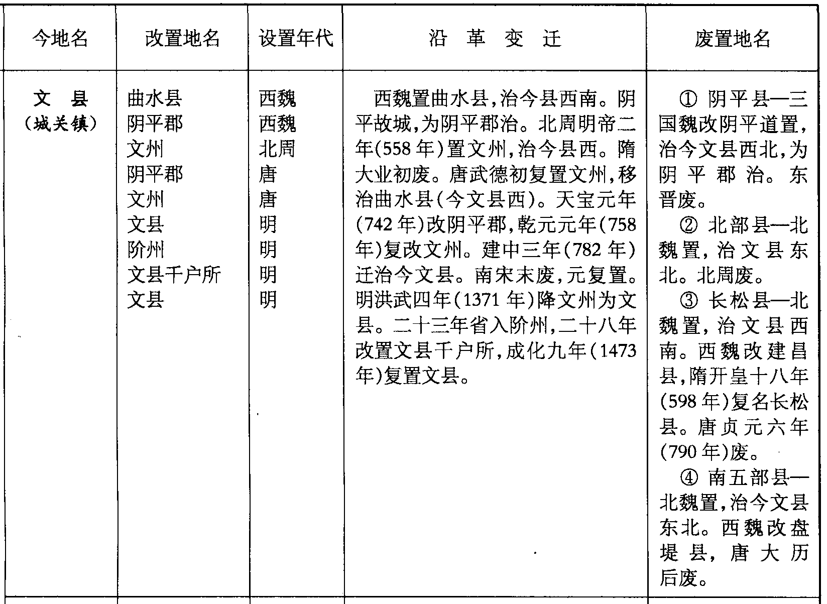 ❸ 长松县—北魏置,治文县西南。西魏改建昌县,隋开皇十八年(598年)复名长松县。唐贞元六年(790年)废。