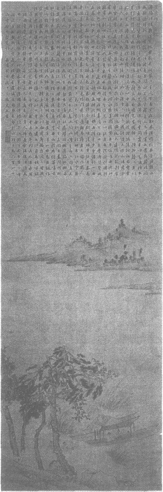 明。文嘉绘。纸本设色。纵130.5厘米,横43.7厘米。北京故宫博物院藏。文嘉(公元1501—1583年)。字休承,号文水,江苏苏州人,文徵明次子。官至和州学正。工小楷书,继承家学。擅画山水,直承父亲衣钵,笔墨疏秀,着色山水有幽淡之致。早年用笔酷似其父,晚年笔法疏简。兼能花卉与篆刻,精于鉴别古书法,亦好作诗。著有《钤山堂书画记》、《续云烟过眼录》、《和州诗》等。此图是以唐代诗人白居易《琵琶行》为题材,描绘白居易从长安被贬到九江期间,一天在“浔阳江头夜送客”时,在船中倾听一位长安故妓弹奏琵琶,诉说天涯沦落的身世,引起白居易的共鸣:“同是天涯沦落人,相逢何必曾相识。”此图绘一泓江水,水波荡漾,近处岸旁二舟泊岸。在一条船上,一妇人正在弹奏琵琶,另两位正聚精会神倾听,岸边枫树、松柏挺立,枝繁叶茂,树下二童子持灯侍候,芦荻随着秋风在水中飘摇。江对岸,远山疏林,意境深远空旷,幽寂萧疏。此图笔法清秀。远景笔墨勾描疏简,近景勾描缜密。款署“癸亥七月晦。文嘉。”下钤<文嘉印>、<文休承印>二方。画上方行书录白居易的《琵琶行》长诗一首,并署有“嘉靖癸亥秋日三桥文彭书”款。此图是文嘉在62岁时所作。