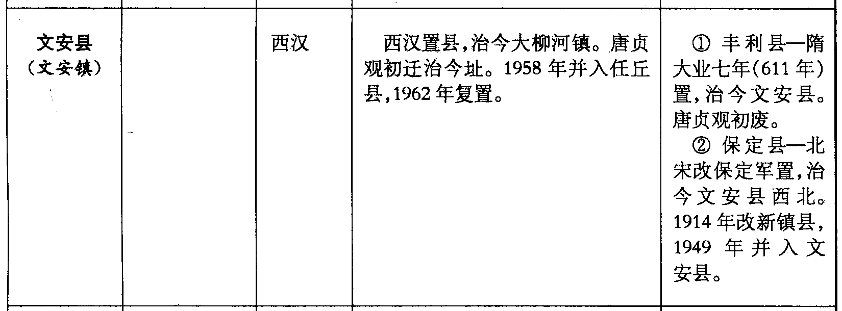 文安县(文安镇)西汉西汉置县,治今大柳河镇。唐贞观初迁治今址。1958年并入任丘县,1962年复置。❶ 丰利县—隋大业七年(611年)置,治今文安县。唐贞观初废。❷ 保定县—北宋改保定军置,治今文安县西北。1914年改新镇县,1949年并入文安县。