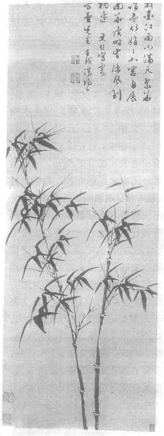 释义 | 文彭墨竹图轴 文彭墨竹图轴明。文彭绘。纸本墨笔。纵89厘米,横31厘米。广东省博物馆藏。文彭(公元1498—1573年),字寿承,号三桥,别号渔阳子,江苏苏州人。文徵明长子,授秀山训导,官至国子监博士。诗写得好,工书画、篆刻。善画墨竹,老笔纵横,直逼文同。也工山水,山水苍郁似吴镇,墨气苍劲。亦善写花果。书法少承家学,不蹈文迹,力自成家,俊美雄逸。工刻印,后人奉为金科玉律。著有《博士集》。此图水墨画两杆错落有致的墨竹。构图巧妙,俊秀伟岸,甚有章法,“叶叶着枝,枝枝着节。”右上自题:“我爱江南小满天,繁花销尽竹娟娟。北窗自展南华读,时有凉风到枕边。文彭写寄方壶先生,壬戌端阳日。”壬戌为明嘉靖四十一年(公元1562年),是文彭65岁时所作。此图曾由舞风堂、顾氏云阁、赵宋臣收藏。 ☚ 仇英停琴听阮图轴 文伯仁溪山仙馆图轴 ☛ |
