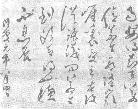 明。纸本。纵31.7厘米,横391厘米。江苏省苏州博物馆藏。文彭(见《文彭草书闲居即事诗》条目)书。此卷草书下款署: “隆庆元年八月四日书,三桥文彭。”“隆庆元年”即公元1567年,是文彭晚年之作。章法跌宕起伏,左欹右侧,动荡感强;运笔屈曲回环,笔势生动,结字变化莫测,天成自然。用笔中锋居多,少有侧笔,笔墨淋漓,气势奔放磅礴,如行云流水,富于抒情表现。其书颇似其父文徵明所作大草书风,同时也可窥见其受宋诸大家的影响。整幅作品显得高古典雅、质朴无华。