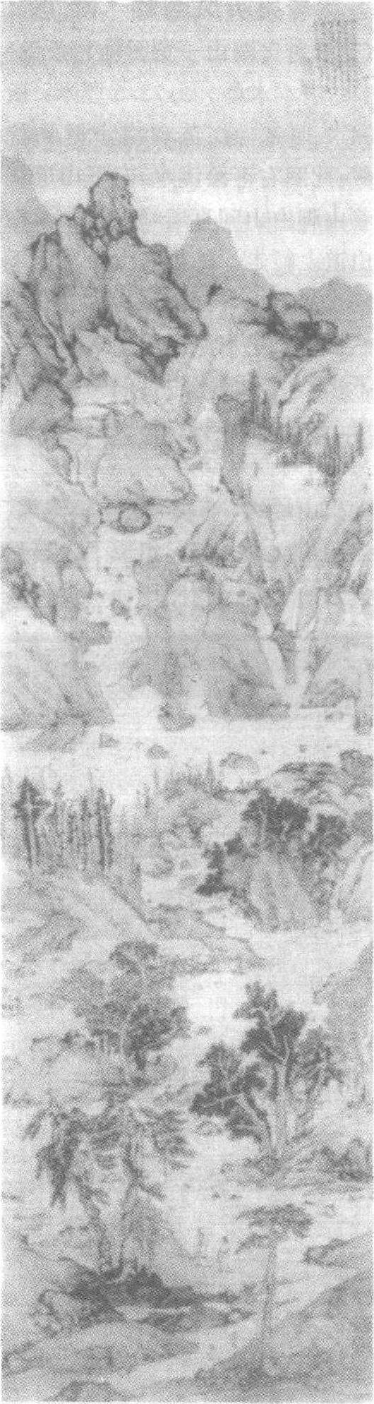 明。文徵明(见《文徵明高人名园图轴》条目)绘。纸本设色。纵132.4厘米,横35.2厘米。江苏省南京博物院藏。此图是文徵明细笔青绿山水的精品。画中山势嵯峨,山峦层叠,树木葱郁。其间溪水从高山峡谷中盘曲奔激而来,万壑争流,源远流长,似可听到潺潺流水之声,蔚为壮观。近处岸边,有四位文人雅士,两两相对,似乎在一边观赏大自然的美景,一边在畅谈,表现了文人陶醉于幽胜山水之中的生活情趣。山石用笔简略,以浓墨苔点。树木夹叶、点叶并用,密而不乱。树的外形和点叶的浓淡也多变化。水纹画得生动,细劲连绵。整个画面构图平稳,后景画得和前景一样明晰,给人一种直观的平面效果,具有很强的装饰意味和美感。此图是文徵明81岁时所作。