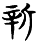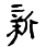 新 甲骨文; 金文; 篆xīn[辛(聲符) +斤(刀斧。意符,甲骨文像用手〈又〉執斤,做砍伐姿勢。後手被簡化)+木(金文後加,意符)→新(《説文》:“新,取木也。從斤, 聲。” 段玉裁給予糾正:“當作從斤、木,辛聲。非從斤, 聲也。”新,甲骨文像以手持斤砍伐,金文加“木”,更明確了砍伐對象。擬新爲“薪”本字,即砍下樹枝當柴燒。從木到柴,在概念上是“新舊更替”。新,指初次出現或經驗到的,與“舊”“老”相對。引申爲最近的〈一年級新生,新落成的大樓〉;剛結婚的女子〈新娘子〉。)] 《詩經·小雅·我行其野》:“不思舊姻,求爾新特。”(不念舊妻太心恨,另求新歡怎心忍。) [宋] 蘇軾 《望江南·春未老》:“休對故人思故國,且將新火試新茶,詩酒趁年華。”(故國,這裏指的是故鄉;新火,寒食節舊俗不生火,節後舉火稱爲新火。) 新xīn(13画)