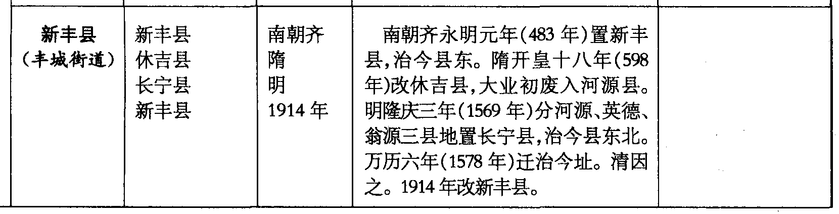 新丰县(丰城街道)新丰县休吉县长宁县新丰县南朝齐隋明1914年南朝齐永明元年(483年)置新丰县,治今县东。隋开皇十八年(598年)改休吉县,大业初废入河源县。明隆庆三年(1569年)分河源、英德、翁源三县地置长宁县,治今县东北。万历六年(1578年)迁治今址。清因之。1914年改新丰县。