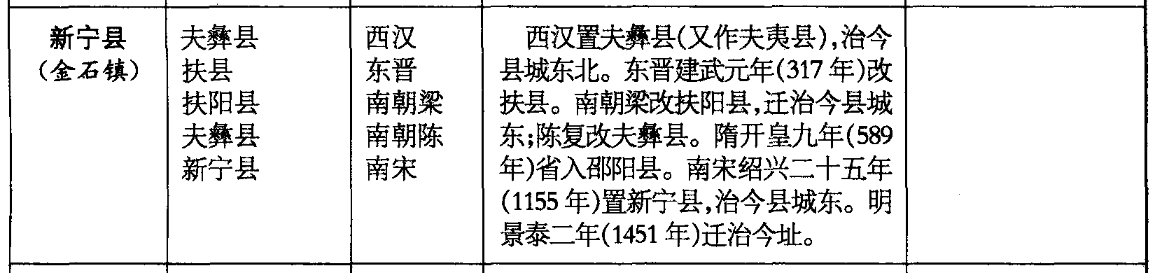 新宁县(金石镇)夫彝县扶县扶阳县夫彝县新宁县西汉东晋南朝梁南朝陈南宋西汉置夫彝县(又作夫夷县),治今县城东北。东晋建武元年(317年)改扶县。南朝梁改扶阳县,迁治今县城东;陈复改夫彝县。隋开皇九年(589年)省入邵阳县。南宋绍兴二十五年(1155年)置新宁县,治今县城东。明景泰二年(1451年)迁治今址。