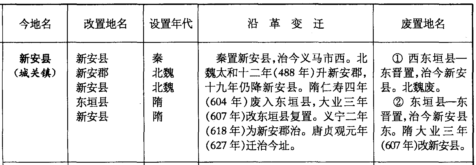 新安县(城关镇)新安县新安郡新安县东垣县新安县秦北魏北魏隋隋秦置新安县,治今义马市西。北魏太和十二年(488年)升新安郡,十九年仍降新安县。隋仁寿四年(604年)废入东垣县,大业三年(607年)改东垣县复置。义宁二年(618年)为新安郡治。唐贞观元年(627年)迁治今址。❶ 西东垣县—东晋置,治今新安县。北魏废。❷ 东垣县—东晋置,治今新安县东。隋大业三年(607年)改新安县。