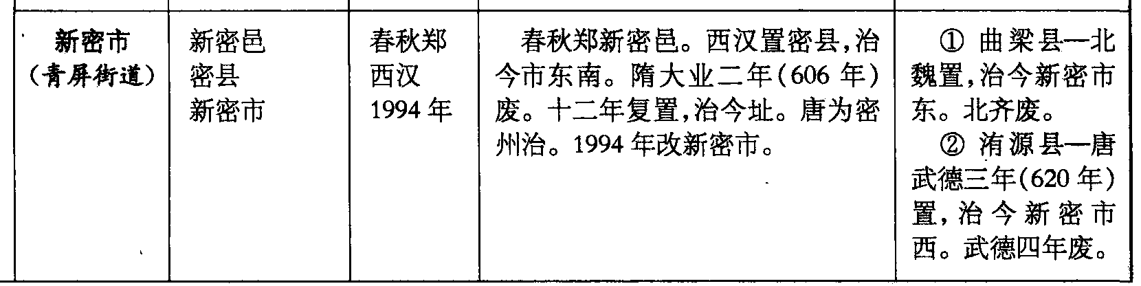 新密市(青屏街道)新密邑密县新密市春秋郑西汉1994年春秋郑新密邑。西汉置密县,治今市东南。隋大业二年(606年)废。十二年复置,治今址。唐为密州治。1994年改新密市。❶ 曲梁县—北魏置,治今新密市东。北齐废。❷ 洧源县—唐武德三年(620年)置,治今新密市西。武德四年废。
