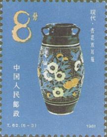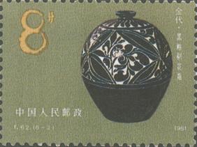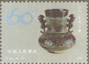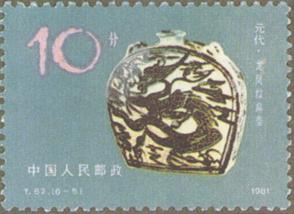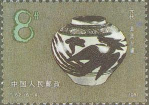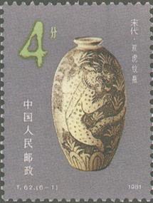 发行日期:1981年4月15日 齿孔度数:(1)(3) ;(2)(4)(5)(6) 印刷版别:影写版 票幅:(1)(3)30×40(2)(4)(5)(6)40×30 全张枚数:(1)(3)50(10×5);(2)(4)(5)(6)50(5×10) 设计者:万维生 摄影:王露 印刷:北京邮票厂       (1)4分 宋代双虎纹瓶 520.66万枚 (2)8分 金代黑釉剔花瓶 1069.66万枚 (3)8分 现代杏花双耳瓶 1076.16万枚 (4)8分 元代双凤纹罐 1012.66万枚 (5)10分 元代龙凤纹扁壶 545.66万枚 (6)60分 现代双虎耳醇 150.66万枚 (1)-(6) 6枚全 |