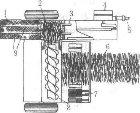 捡拾压捆机工作示意图 1. 已捆扎的草捆 2.拔齿式喂入器 3.压缩活塞 4. 飞轮 5. 主传动轴 6.草条 7.捡拾器 8. 螺旋输送器 9. 捆绳 |