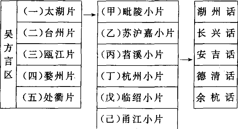 方言分区层次各地方言亲疏关系在方言分区中的反映。 根据各地方言特点的异同, 汉语方言可分成若干方言区。 一个方言区内部, 各地方言又有不同特点, 还可以再分成若干小的方言区。 这就出现了方言分区的层次性。 汉语方言分区大致有五个层次, 即“大区—区—片—小片—点”。 其中, 区、 片和点是最基本的。 区底下可以分成若干片, 片有时分成若干小片。 点, 指的是调查点, 一般是县 (市) 或相当于县(市)的行政区单位。有些方言, 区上面没有大区这一层, 如吴方言区; 只有官话方言有大区这一层。 下面以吴方言区为例, 列表说明。