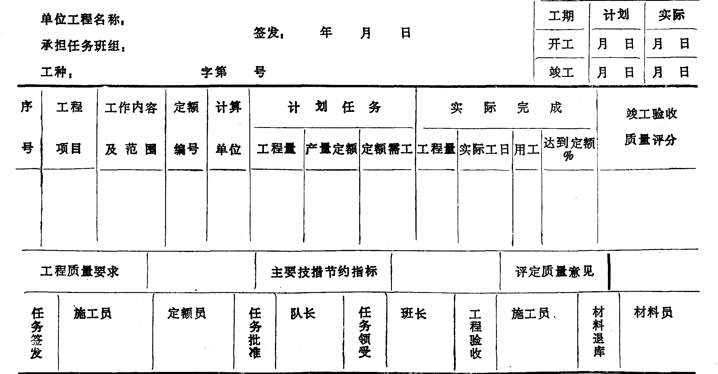 亦称“工程任务单”。这是施工企业所属基层单位对生产班组下达施工任务,并在任务完成后记录完成情况,据以验收的书面凭证。施工任务单主要包括:应完成的工作内容、工程数量、质量要求、操作方法、用工日数、施工期限等。班组于完成施工任务后,将执行结果按要求进行登记,据以验收,并结算工资。施工任务单的参考格式如下: