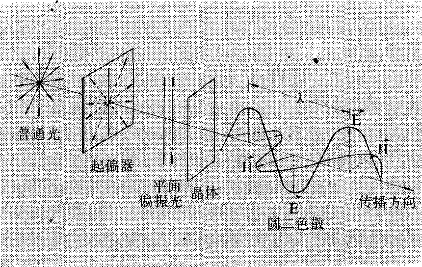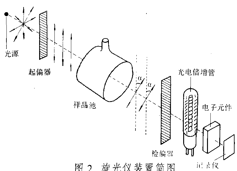 在真空中,左旋和右旋圆偏振光的速度相等,均为: v=c/n 式中 c是真空中的光速,n是光线通过介质时的折射率。光活性物质对于左旋和右旋偏振光的折射率是不同的。在不对称介质中,圆偏振光波的速度相对于镜像波的速度发生改变。因此旋光是一个圆偏振分量相对于其镜像分量发生速度变化而引起的,旋光发生在分子一级上。当平面偏振光通过不对称介质时,偏振面从其起始位置偏转了一个角度,这个角度即为旋光度,常用α表示。其大小与待测物质的种类、浓度、温度、液层厚度、光的波长以及所用的溶剂有关。为了便于互相比较,通常用比旋光度[α]λt来表示各种光活性物质(包括光活性农药)的旋光方向和旋光能力的大小。在指定的条件下,某种光活性物质的比旋光度是一个常数。纯净液体的比旋光度用下式求得:因此比旋光度[α]tλ是在液层厚度L为1分米,密度为d(克/厘米3)、温度为t,波长为λ时所测得的旋光度。在溶液情况下,式中d应改为浓度c(克/升)。 测定 旋光度可用旋光仪和圆二色散仪两种方法测定。 旋光仪测定法 利用旋光仪在波长为589.3纳米的钠黄光下,测定光活性物质旋光度的方法。 旋光仪主要由光源、起偏镜(器)、检偏镜(器)和旋光管组成(图2)。