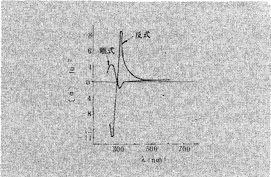 起偏镜和检偏镜都是由尼柯尔棱镜制成的。起偏镜固定不能旋转,检偏镜可以旋转,旋转的角度可以从刻度盘读出。近代的旋光仪应用光电池和数字显示代替刻度盘。其操作主要是称取一定量的样品,配成溶液,注入旋光管中进行测定。旋转检偏镜,使最大量的光线能够通过,然后放入旋光管。通过旋光管出来的平面偏振光被旋转了一定的角度。这时检偏镜需要旋转相同的角度才能使最大量的光线通过。旋转的角度为旋光度α,可以从仪器上读出。由于旋光管的长度L,以及光活性物质的密度d或浓度c也都是已知的,因此可以按上述公式计算出比旋光度[α]tλ。如果检偏镜向右旋转,为右旋物质,用符号(+)或d表示;使检偏镜向左旋,为左旋物质,用符号(-)或l表示。 当某种光活性物质的比旋光度为已知时,可以用旋光仪在相同的条件下测定其溶液的旋光度,然后应用上述公式计算出它的浓度。根据测得的比旋光度还可以计算光活性化合物的光学纯度。 圆二色散仪测定法 利用圆二色散仪测出化合物对不同波长光的圆二色散谱,以求得旋光度的方法。圆二色散谱是一种连续吸收光谱,其波长范围常选择在200~700纳米,从图谱上可得到不同波长下的旋光度值。它与化合物的紫外、红外、核磁共振光谱原理相同,也是电磁波与有机化合物分子相互作用的结果,但它反映化合物结构上的不同要比紫外、红外灵敏得多。因此可获得更多、更准确的化合物结构、构象、构型方面的信息。例如下述顺式和反式对映体结构上的细微不同也能得到反映,而用旋光仪或其他方法是不能得到的。(图3) 圆二色散光谱用圆二色散仪来测定。仪器简单框图如图4所示。从起偏器出来的平面偏振光,经晶体后,调制成一定频率(波长范围200~700纳米)的圆偏振光,通过样品后,在电子记录元件上即可得圆二色散谱。 ![]() 图3 顺式和反式-10- 甲基-2-萘烷酮的圆二色散谱 (据 Robert Caserio,1977)