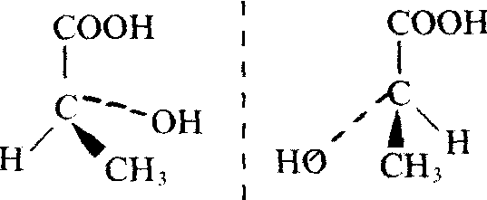 碳原子与4个互不相同的原子或基团相连时,可以产生两种不同的空间排布方式 (即两种构型),它们互成实物与镜像关系,其中之一可使平面偏振光向左旋转,另一则向右旋转,两者的旋转方向相反,但旋转度数相同。该两种不同构型的化合物称为旋光异构体或光学异构体,其现象称为旋光异构现象。例如,乳酸有两种构型,可用透视式表示如下: