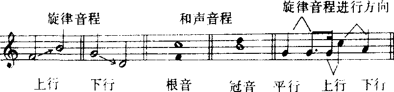 两个音先后出现为旋律音程。两个音同时出现为和声音程。旋律音程依照它进行的方向分为上行、下