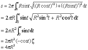解 半径为R的球的面积S等于半圆x= Rcost,y=Rsint (θ≤t≤n)绕X轴旋转所成旋转体的侧面积。于是,根据旋转体侧面积公式,有