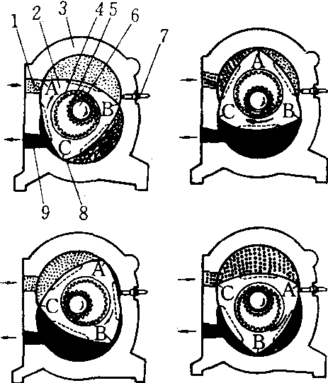 释义 | 旋转活塞式发动机rotary engine,Wankel engine又称转子发动机或转子机。以旋转活塞代替往复运动活塞的动力机。由德国汪克尔(Felix Wankel)发明,国际上称为汪克尔发动机。具有重量轻、体积小、升功率高、结构简单、零部件数量少、制造成本低、运转平稳等优点。在一些国家已得到广泛应用。这种发动机工作时,三角形活塞作旋转运动,活塞内腔被分割成三部分,其容积发生周期性变化,以形成四冲程循环。由于曲轴上的齿轮与活塞上的内齿轮转速比为3:1,当曲轴转三圈,活塞转一圈,完成一次循环,汽缸内气体压力通过旋转活塞带动曲轴旋转对外作功。