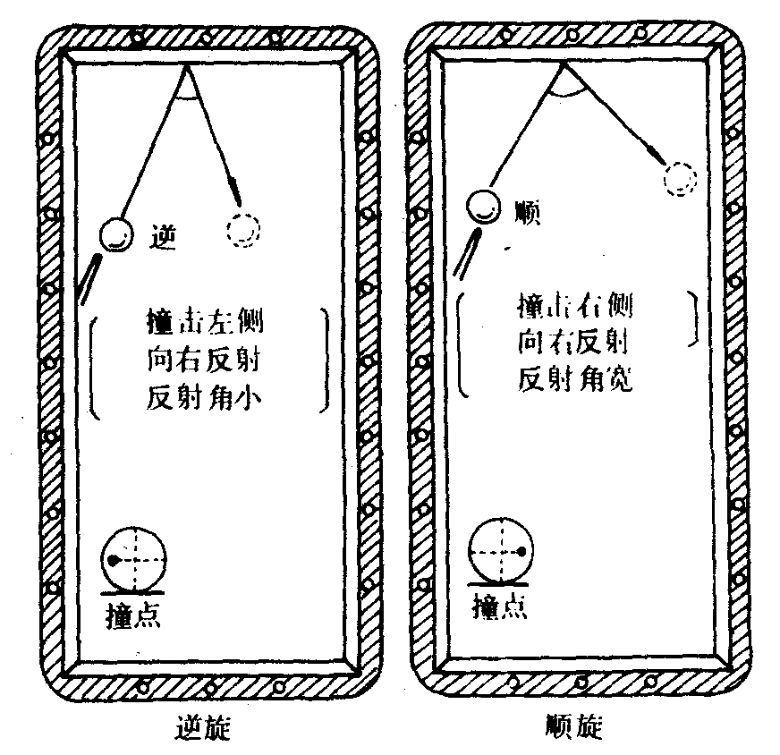 释义 | 旋转球杆法 旋转球杆法台球击球的一种方法。是用撞点为左侧或右侧的杆法击球,若撞击本球的右侧,则在向右旋的同时还向前行进,若撞击本球的左侧,则在向左旋的同时还向前行进,打旋转球的意图是使球产生侧旋力,也称侧旋球。侧旋球有顺旋和逆旋之分,使本球向右分离并反射,是撞击本球的右侧造成的顺旋。使本球向左分离并反射,是撞击本球的左侧造成的逆旋。(图2—3—41)采用顺旋或逆旋杆法,碰岸后会出现侧旋的变化。顺旋碰岸后,球的反射角会增大,逆旋碰岸后,球的反射角会缩小。