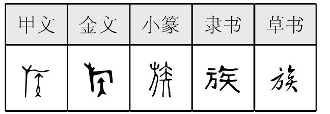 族 甲骨文; 金文; 篆zú[ (旗,意符)+矢(箭,意符)→族(《説文》:“族,矢鋒也。束之族族也。從 ,從矢。”族,“簇”本字。古代部落,聚居,有自己的旗幟,有自己的矢,矢即箭,平時狩獵,戰時用爲武器。聚居的部落是宗族、家族、民族形成的基礎。古代酷刑〈滅族,一人有罪,刑及父母兄弟妻子〉。引申爲事物具有共同屬性的一大類〈水族、語族、芳香族〉。)] [西漢] 司馬遷 《史記·樂書》:“在族長鄉里之中,長幼同聽之,則莫不和順。”(在同一家族或同一鄉里之間,老少共同欣賞〈音樂〉,無不心平氣和。) 族zú(11画)