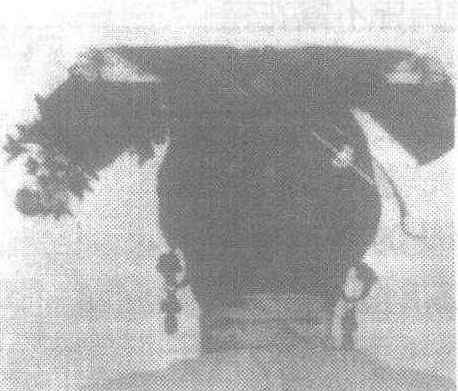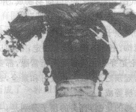 旗髻 旗髻清代满族妇女所戴的假髻。在道光以前,满族妇女梳髻,一般多在髻中插上一个筐架,俗谓 “架子头”。得硕亭《草珠一串》诗:“头名架子太荒唐,脑后双垂一尺长。”诗下自注:“近时妇女以双架插发际,挽发如双角形,曰‘架子头’。”从形象资料上看,这个时期的旗髻,尚未脱离真髻的范畴,体积也不大。咸丰以后,髻式逐渐增高,“双角”也不断扩大,进而发展成一种高如牌楼式的固定饰物,上面不用头发,纯粹以绸缎为之,戴时只要套在头上即可,俗谓“两把头”或称“大拉翘”。