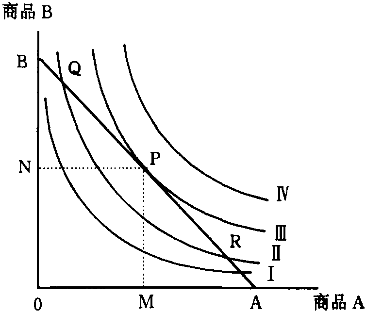 如图1和表所示,在坐标图上以横轴表示A商品的数量,以纵轴表示B商品的数量,A、B两种商品的一系列无差异配合将表现为许多点,通过所有这些点的平滑的曲线就是“无差异曲线”。其特点: (1)距离原点越远的无差异曲线所代表的效用水平越高。(2) 任何两条无差异曲线不能相交。(3) 无差异曲线凸向原点斜率递减。(4) 无差异曲线向右下方倾斜,斜率为负。无差异曲线是由英国经济学家F·埃奇沃思 (1845~1926) 在1881年出版的《数字心理学》 一书中首次提出来的,1909年,由帕累托(Pareto) 引入经济分析。现在无差异曲线已成为西方经济学中的一个常见的理论分析工具,被广泛应用于消费者行为理论、新福利经济学等方面。20世纪30年代后,当代西方需求理论有了长足的发展。这一发展的核心是无差异曲线理论在需求理论中的运用。西方经济学运用无差异曲线分析法,建立了以序数效用论为基础的需求理论,又称消费者行为理论。这种建立在序数效用基础上的需求理论,与“边际革命” 时期在基数效用基础上建立起来的需求理论一起,成为当代西方经济学需求理论的两大基本组成部分。 预算线又称 “消费可能线” 或 “等支出线”,是反映消费者在收入与收入既定条件下对两种商品进行购买时可能具有的全部最大选择组合方式的曲线。在市场经济中,消费者的购买行为具有这样的特点: 一方面,消费者可以对若干种类的商品进行一系列的选择组合;另一方面,消费者有限的收入又限制着每一种选择组合的数量。假如消费者选择的是两种商品,并且这两种商品的价格既定,那么消费者一定的货币收入水平构成这样一种界限: 它规定消费在两种商品上可能实现的全部最大选择组合的范围。把上述收入对消费选择组合的关系在平面坐标上表示出来,可得到一条曲线,该曲线就称为预算线,如图2所示。假定某一消费者的固定收入为Y0,商品q1和q2的价格分别为P1,P2,这样,消费者的预算约束就是: ![]() 图1 图2 预算线的斜率表示两种商品的价格比率的负数,即-P1/P2。当一种商品价格或消费者收入变动时会引起预算线的变动。若商品价格一定时,收入的变动会使预算线平行地向外或向里移动,简称预算线位置的移动; 若收入一定时,一种商品的价格变动,会使预算线依另一种商品的最大选择量点为中心作上旋或下旋变动,简称预算线的形状变动。 图3 无差异曲线和预算线可用来确定消费者在购买两种物品时的最优选择(即消费者均衡)。如图3所示,AB线为预算线,而Ⅰ 、Ⅱ 、Ⅲ和Ⅳ等曲线是某个消费者的无数条无差异线中的一部分。在现有的货币收入条件下,消费者受有限收入的限制不可能达到预算线以外的任何一条无差异曲线(如曲线Ⅳ)所代表的效用水平。P、Q和R点则代表现有收入所能达到的效用水平,其中P点 (即预算线与无差异曲线的切点) 处于最高的效用水平上,这是因为,AB线段上的任何其他点都处在低于曲线Ⅲ这条无差异曲线(如曲线Ⅰ和曲线Ⅱ) 的位置上,在点P上,消费者的有限收入实现了最大效用,因此,无差异曲线与预算线的切点代表消费者的均衡量。 ☚ 等产量曲线 均衡价格 ☛ |