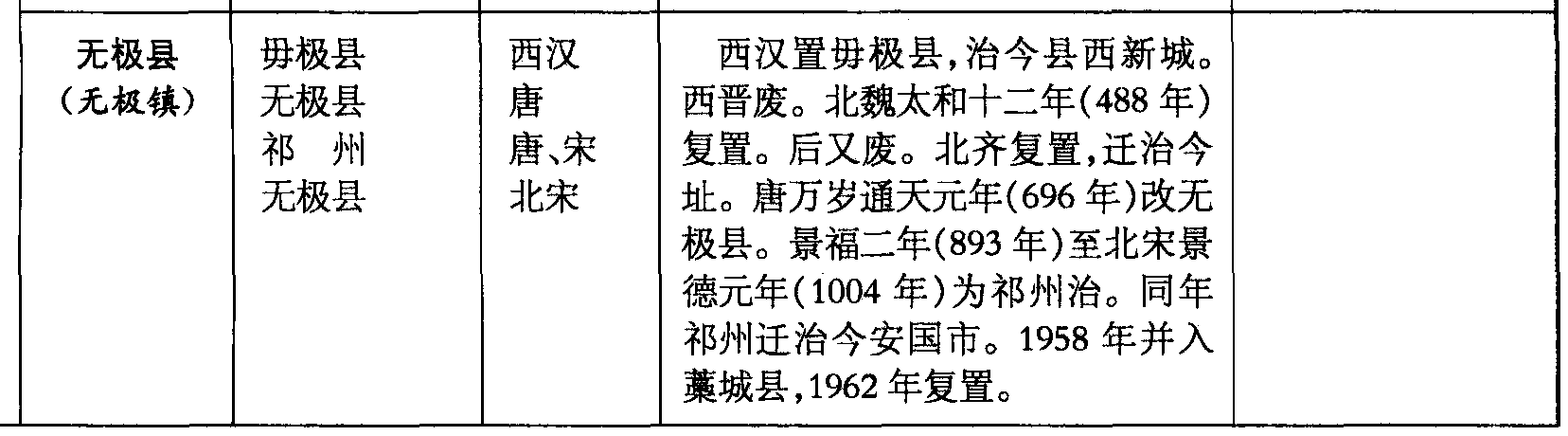 无极县(无极镇)毋极县无极县祁州无极县西汉唐唐、宋北宋西汉置毋极县,治今县西新城。西晋废。北魏太和十二年(488年)复置。后又废。北齐复置,迁治今址。唐万岁通天元年(696年)改无极县。景福二年(893年)至北宋景德元年(1004年)为祁州治。同年祁州迁治今安国市。1958年并入藁城县,1962年复置。