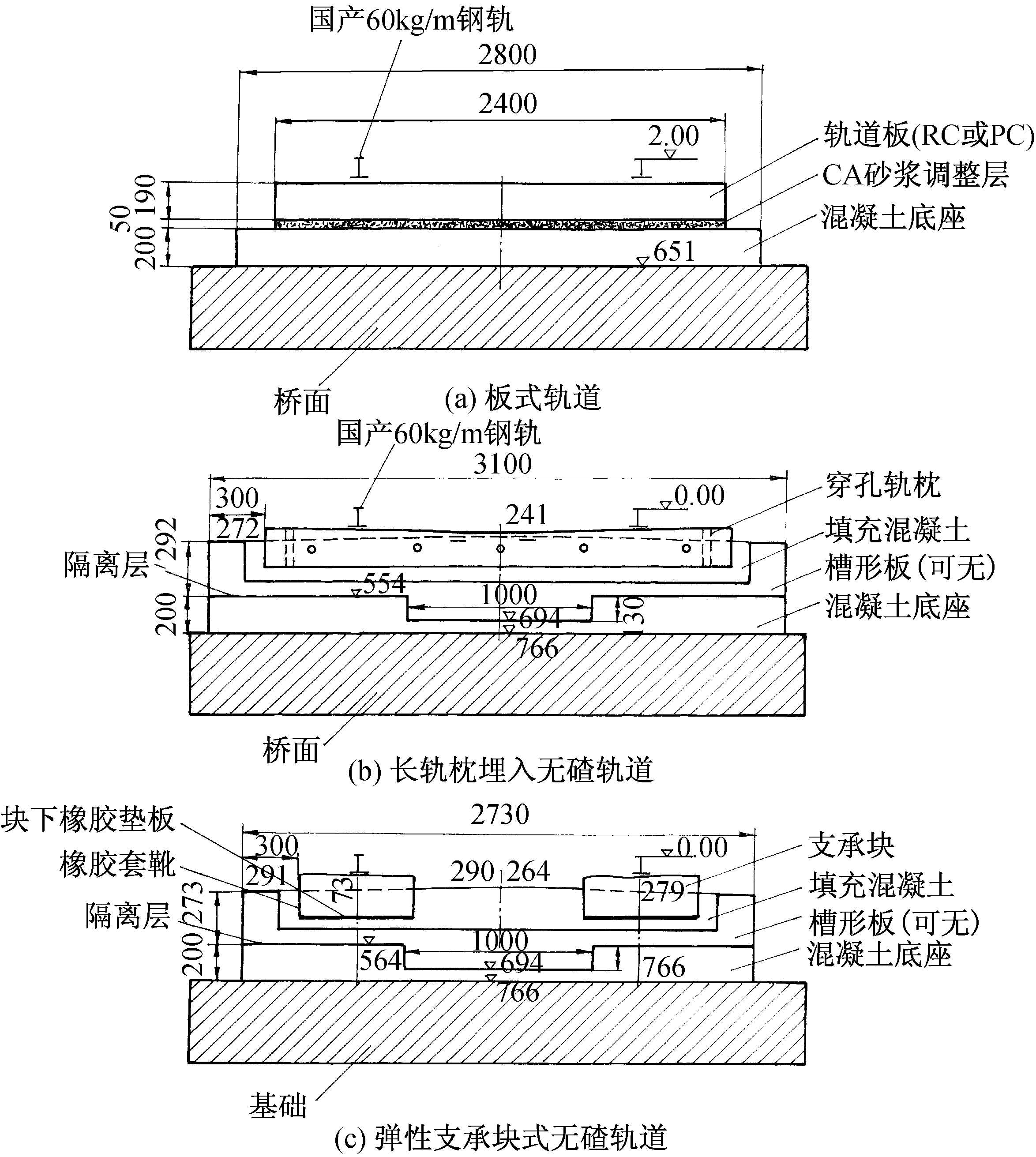 “铁路轨道”的一种。与有碴轨道的主要区别在于轨下基础,即取消道碴的道床,代之以混凝土板、长枕埋入式和弹性支承块式的无碴轨下基础(见下图)。中国参照日本的板式轨道、德国Rheda长枕埋入轨道和英吉利海峡的弹性支承块式轨道,自行设计了上述三种无碴轨道,分别铺设在秦(秦皇岛)沈(沈阳)160km/h以上快速客运专线的狗河、沙河和双河特大桥上及安(西安)康(安康)线的18.46km两座单线特长秦岭隧道内。经过运营证明它们安全可靠、平顺性好。无碴轨道最显著的优越性是养护维修工作量少,可节省大量的养护维修费用,故又称少维修轨道。